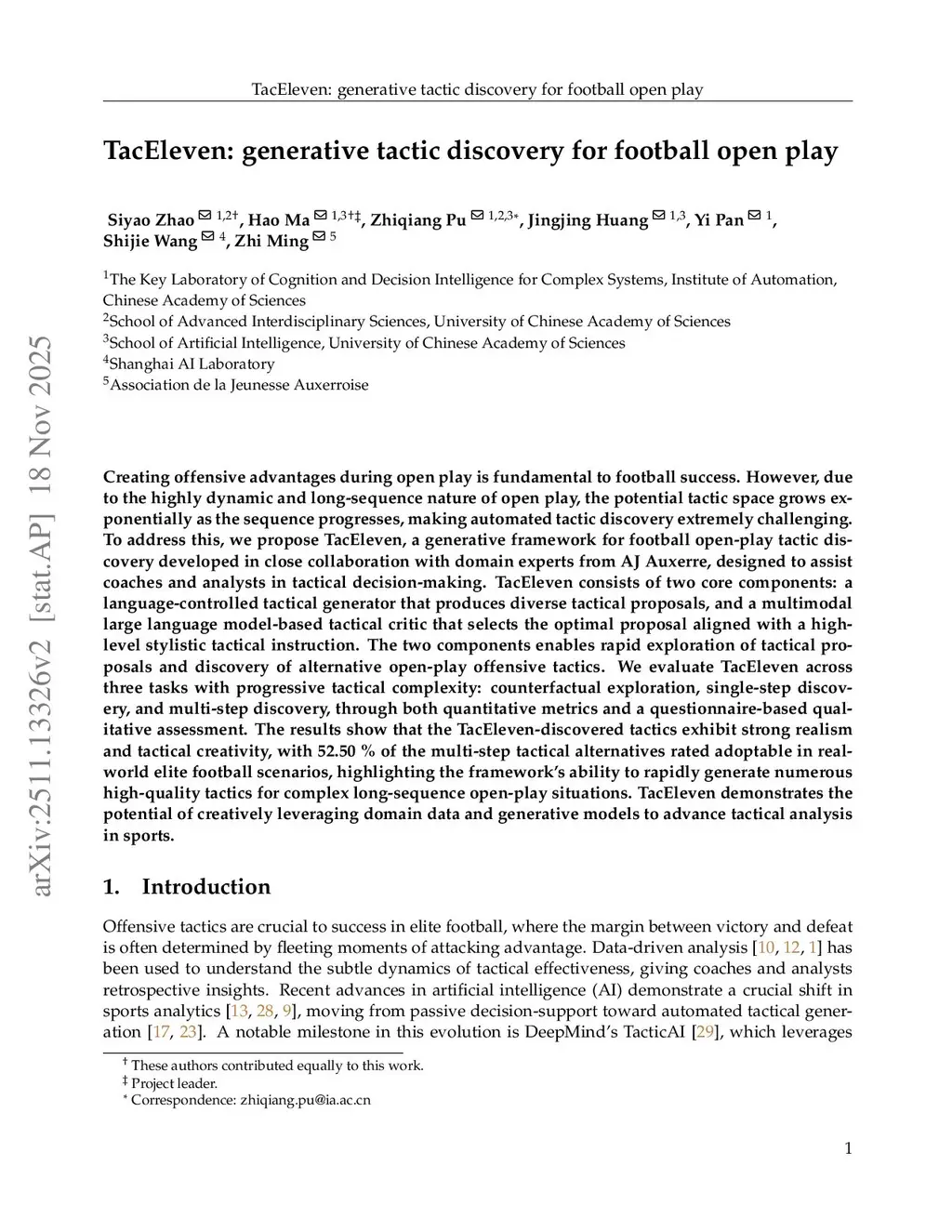 Creating offensive advantages during open play is fundamental to football success. However, due to the highly dynamic and long-sequence nature of open play, the potential tactic space grows exponentially as the sequence progresses, making automated tactic discovery extremely challenging. To address this, we propose TacEleven, a generative framework for football open-play tactic discovery developed in close collaboration with domain experts from AJ Auxerre, designed to assist coaches and analysts in tactical decision-making. TacEleven consists of two core components: a language-controlled tactical generator that produces diverse tactical proposals, and a multimodal large language model-based tactical critic that selects the optimal proposal aligned with a high-level stylistic tactical instruction. The two components enables rapid exploration of tactical proposals and discovery of alternative open-play offensive tactics. We evaluate TacEleven across three tasks with progressive tactical complexity: counterfactual exploration, single-step discovery, and multi-step discovery, through both quantitative metrics and a questionnaire-based qualitative assessment. The results show that the TacEleven-discovered tactics exhibit strong realism and tactical creativity, with 52.50% of the multi-step tactical alternatives rated adoptable in real-world elite football scenarios, highlighting the framework's ability to rapidly generate numerous high-quality tactics for complex long-sequence open-play situations. TacEleven demonstrates the potential of creatively leveraging domain data and generative models to advance tactical analysis in sports.