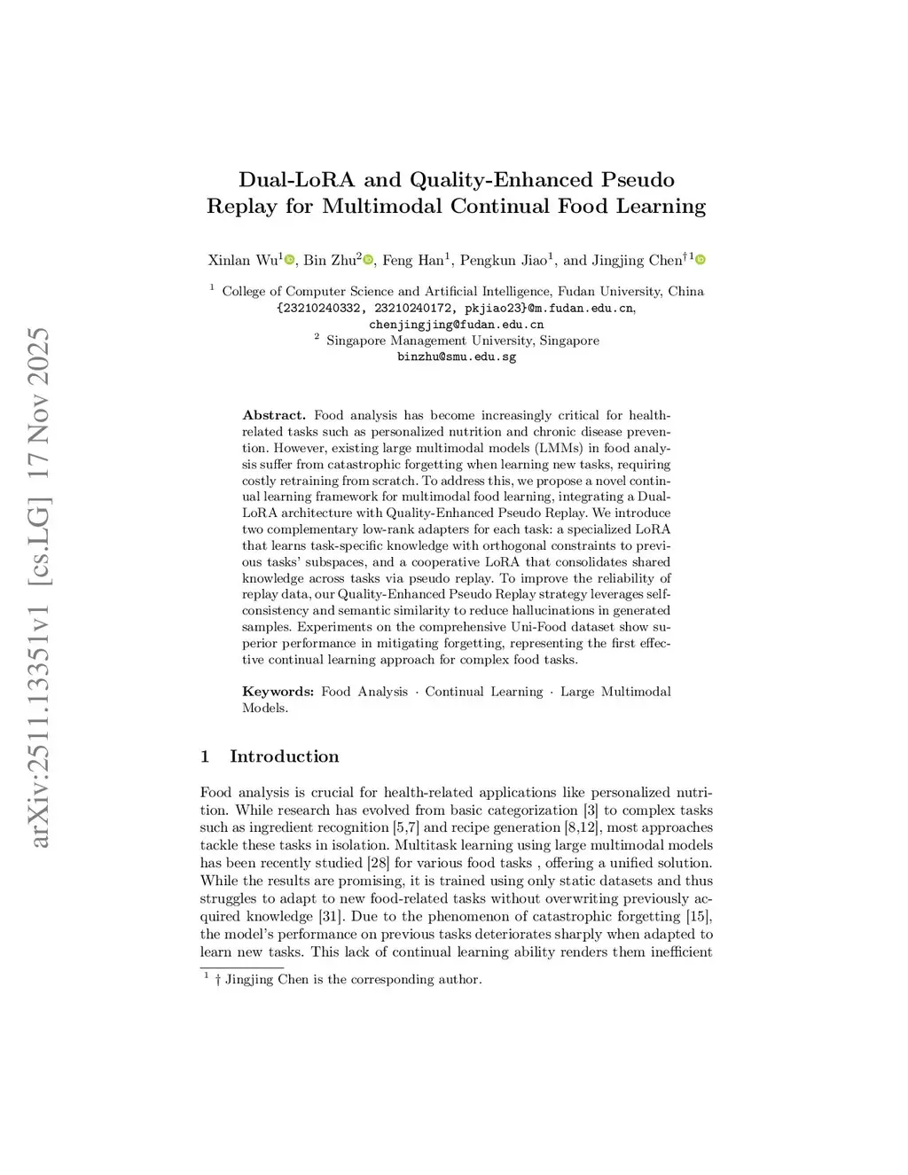 Food analysis has become increasingly critical for health-related tasks such as personalized nutrition and chronic disease prevention. However, existing large multimodal models (LMMs) in food analysis suffer from catastrophic forgetting when learning new tasks, requiring costly retraining from scratch. To address this, we propose a novel continual learning framework for multimodal food learning, integrating a Dual-LoRA architecture with Quality-Enhanced Pseudo Replay. We introduce two complementary low-rank adapters for each task: a specialized LoRA that learns task-specific knowledge with orthogonal constraints to previous tasks' subspaces, and a cooperative LoRA that consolidates shared knowledge across tasks via pseudo replay. To improve the reliability of replay data, our Quality-Enhanced Pseudo Replay strategy leverages self-consistency and semantic similarity to reduce hallucinations in generated samples. Experiments on the comprehensive Uni-Food dataset show superior performance in mitigating forgetting, representing the first effective continual learning approach for complex food tasks.