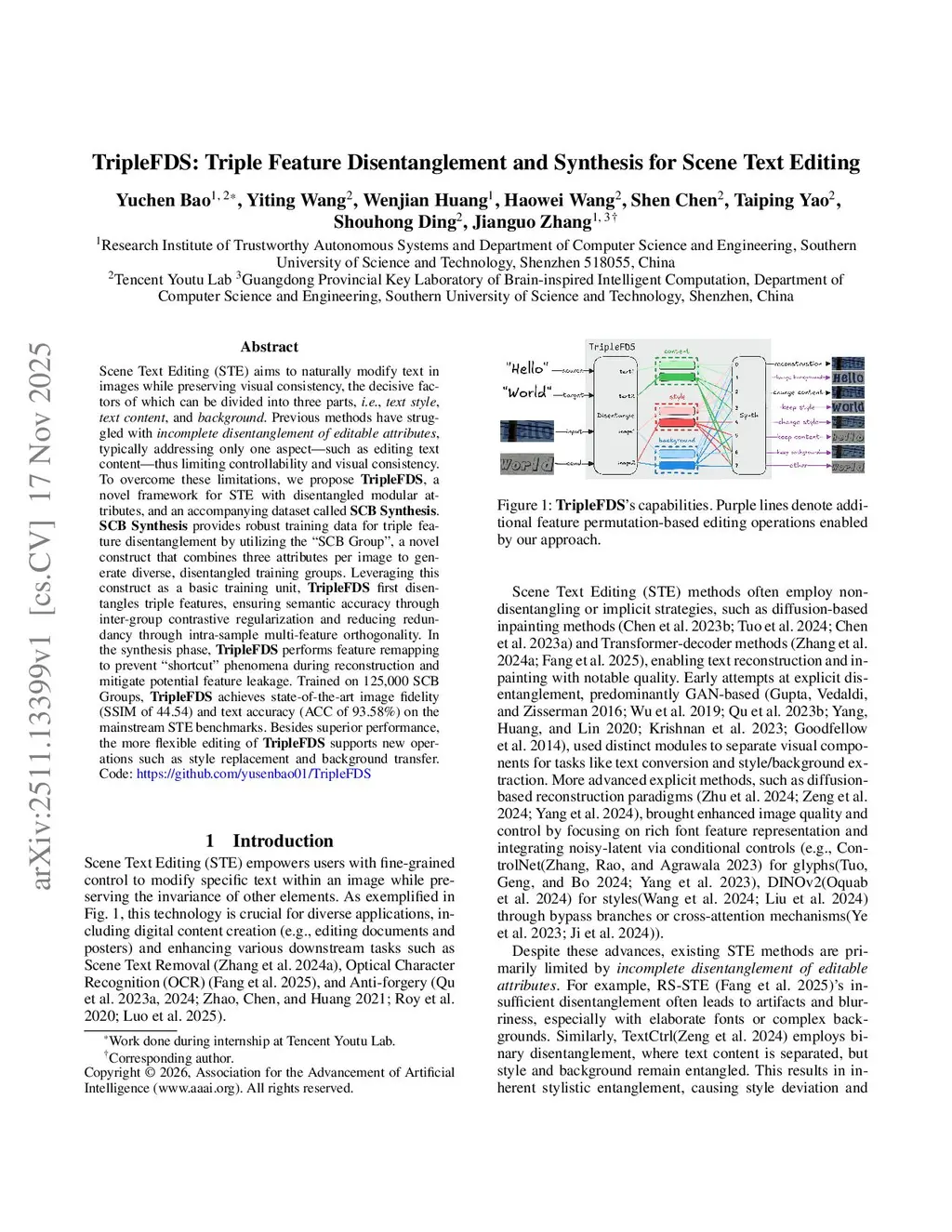 TripleFDS: Triple Feature Disentanglement and Synthesis for Scene Text Editing