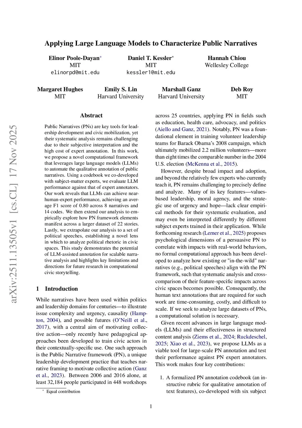 Public Narratives (PNs) are key tools for leadership development and civic mobilization, yet their systematic analysis remains challenging due to their subjective interpretation and the high cost of expert annotation. In this work, we propose a novel computational framework that leverages large language models (LLMs) to automate the qualitative annotation of public narratives. Using a codebook we co-developed with subject-matter experts, we evaluate LLM performance against that of expert annotators. Our work reveals that LLMs can achieve near-human-expert performance, achieving an average F1 score of 0.80 across 8 narratives and 14 codes. We then extend our analysis to empirically explore how PN framework elements manifest across a larger dataset of 22 stories. Lastly, we extrapolate our analysis to a set of political speeches, establishing a novel lens in which to analyze political rhetoric in civic spaces. This study demonstrates the potential of LLM-assisted annotation for scalable narrative analysis and highlights key limitations and directions for future research in computational civic storytelling.