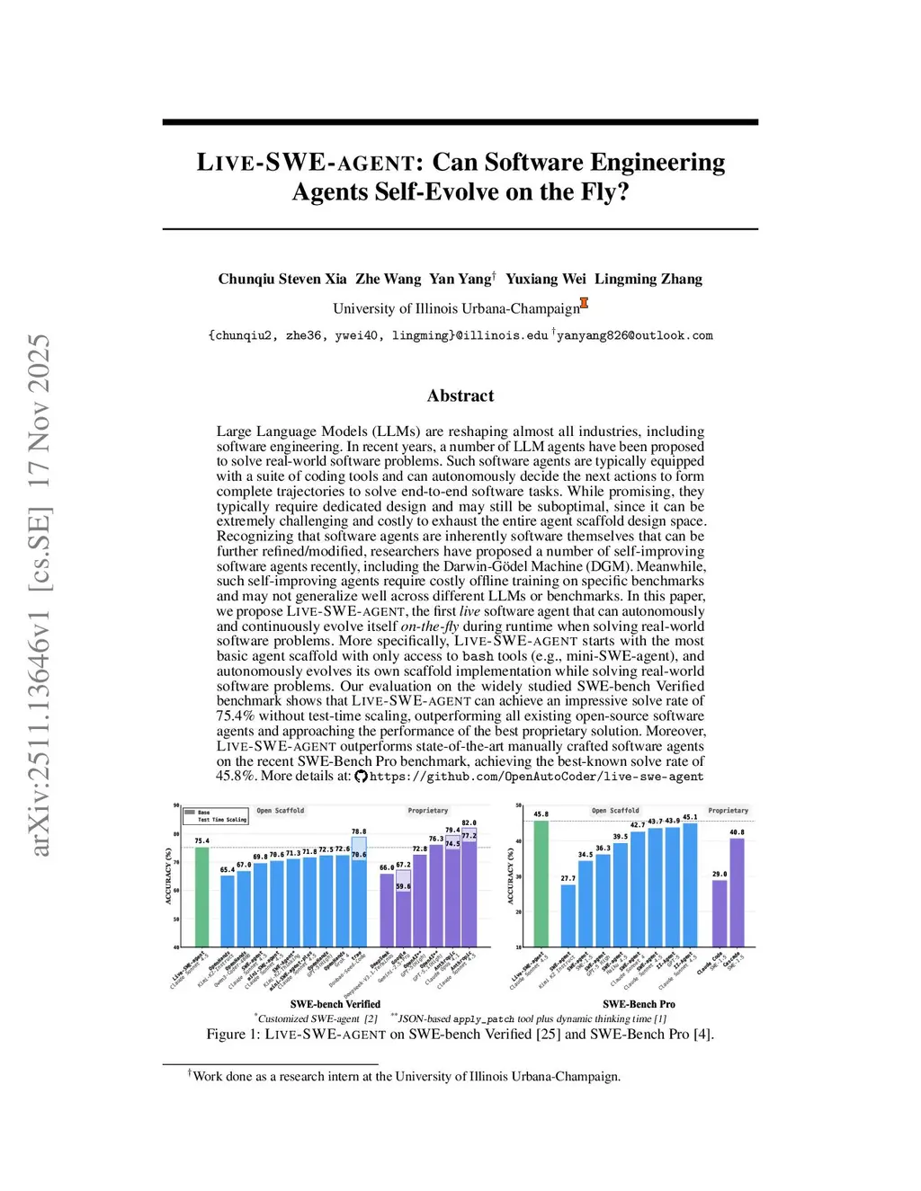 Large Language Models (LLMs) are reshaping almost all industries, including software engineering. In recent years, a number of LLM agents have been proposed to solve real-world software problems. Such software agents are typically equipped with a suite of coding tools and can autonomously decide the next actions to form complete trajectories to solve end-to-end software tasks. While promising, they typically require dedicated design and may still be suboptimal, since it can be extremely challenging and costly to exhaust the entire agent scaffold design space. Recognizing that software agents are inherently software themselves that can be further refined/modified, researchers have proposed a number of self-improving software agents recently, including the Darwin-Gödel Machine (DGM). Meanwhile, such self-improving agents require costly offline training on specific benchmarks and may not generalize well across different LLMs or benchmarks. In this paper, we propose Live-SWE-agent, the first live software agent that can autonomously and continuously evolve itself on-the-fly during runtime when solving real-world software problems. More specifically, Live-SWE-agent starts with the most basic agent scaffold with only access to bash tools (e.g., mini-SWE-agent), and autonomously evolves its own scaffold implementation while solving real-world software problems. Our evaluation on the widely studied SWE-bench Verified benchmark shows that LIVE-SWE-AGENT can achieve an impressive solve rate of 77.4% without test-time scaling, outperforming all existing software agents, including the best proprietary solution. Moreover, Live-SWE-agent outperforms state-of-the-art manually crafted software agents on the recent SWE-Bench Pro benchmark, achieving the best-known solve rate of 45.8%.