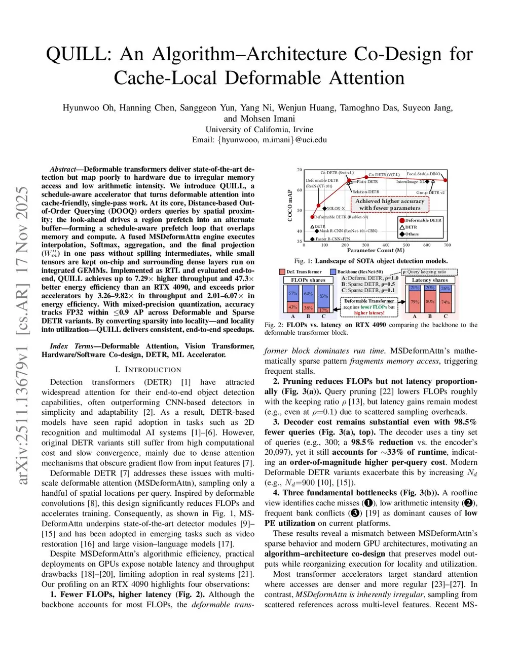 Deformable transformers deliver state-of-the-art detection but map poorly to hardware due to irregular memory access and low arithmetic intensity. We introduce QUILL, a schedule-aware accelerator that turns deformable attention into cache-friendly, single-pass work. At its core, Distance-based Out-of-Order Querying (DOOQ) orders queries by spatial proximity; the look-ahead drives a region prefetch into an alternate buffer--forming a schedule-aware prefetch loop that overlaps memory and compute. A fused MSDeformAttn engine executes interpolation, Softmax, aggregation, and the final projection (W''m) in one pass without spilling intermediates, while small tensors are kept on-chip and surrounding dense layers run on integrated GEMMs. Implemented as RTL and evaluated end-to-end, QUILL achieves up to 7.29x higher throughput and 47.3x better energy efficiency than an RTX 4090, and exceeds prior accelerators by 3.26-9.82x in throughput and 2.01-6.07x in energy efficiency. With mixed-precision quantization, accuracy tracks FP32 within <=0.9 AP across Deformable and Sparse DETR variants. By converting sparsity into locality--and locality into utilization--QUILL delivers consistent, end-to-end speedups.