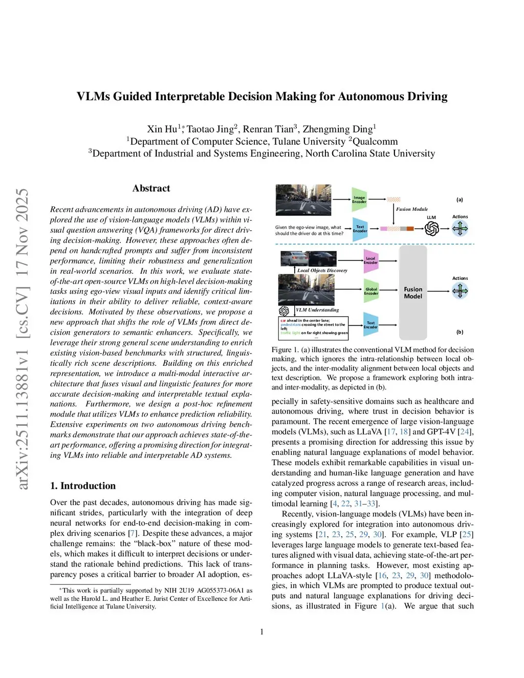 Recent advancements in autonomous driving (AD) have explored the use of vision-language models (VLMs) within visual question answering (VQA) frameworks for direct driving decision-making. However, these approaches often depend on handcrafted prompts and suffer from inconsistent performance, limiting their robustness and generalization in real-world scenarios. In this work, we evaluate state-of-the-art open-source VLMs on high-level decision-making tasks using ego-view visual inputs and identify critical limitations in their ability to deliver reliable, context-aware decisions. Motivated by these observations, we propose a new approach that shifts the role of VLMs from direct decision generators to semantic enhancers. Specifically, we leverage their strong general scene understanding to enrich existing vision-based benchmarks with structured, linguistically rich scene descriptions. Building on this enriched representation, we introduce a multi-modal interactive architecture that fuses visual and linguistic features for more accurate decision-making and interpretable textual explanations. Furthermore, we design a post-hoc refinement module that utilizes VLMs to enhance prediction reliability. Extensive experiments on two autonomous driving benchmarks demonstrate that our approach achieves state-of-the-art performance, offering a promising direction for integrating VLMs into reliable and interpretable AD systems.