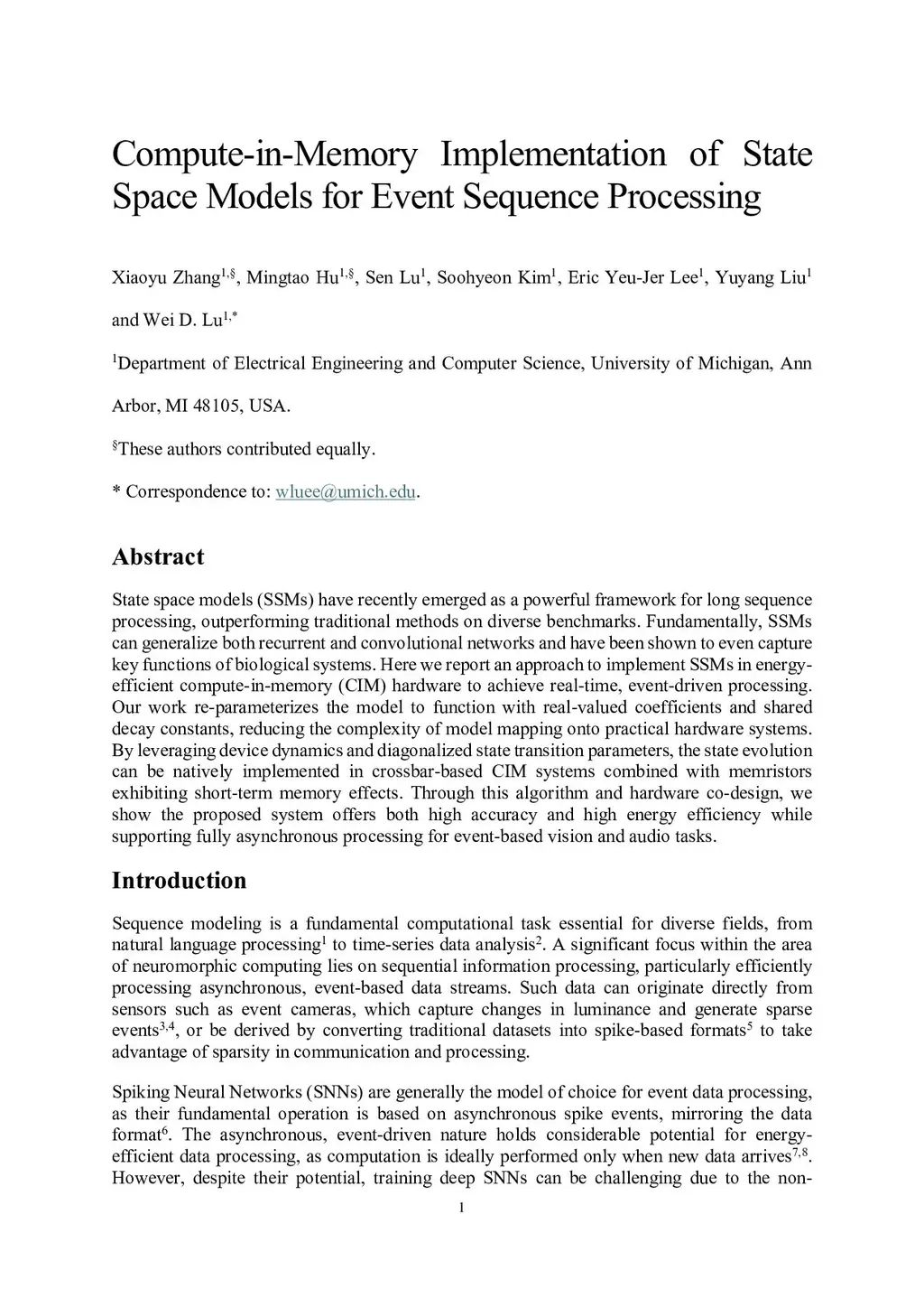 Compute-in-Memory Implementation of State Space Models for Event Sequence Processing