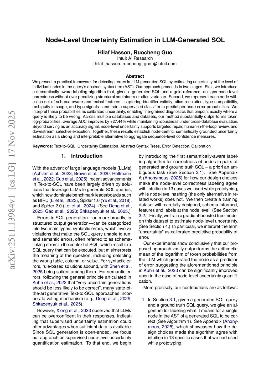 We present a practical framework for detecting errors in LLM-generated SQL by estimating uncertainty at the level of individual nodes in the query's abstract syntax tree (AST). Our approach proceeds in two stages. First, we introduce a semantically aware labeling algorithm that, given a generated SQL and a gold reference, assigns node-level correctness without over-penalizing structural containers or alias variation. Second, we represent each node with a rich set of schema-aware and lexical features - capturing identifier validity, alias resolution, type compatibility, ambiguity in scope, and typo signals - and train a supervised classifier to predict per-node error probabilities. We interpret these probabilities as calibrated uncertainty, enabling fine-grained diagnostics that pinpoint exactly where a query is likely to be wrong. Across multiple databases and datasets, our method substantially outperforms token log-probabilities: average AUC improves by +27.44% while maintaining robustness under cross-database evaluation. Beyond serving as an accuracy signal, node-level uncertainty supports targeted repair, human-in-the-loop review, and downstream selective execution. Together, these results establish node-centric, semantically grounded uncertainty estimation as a strong and interpretable alternative to aggregate sequence level confidence measures.