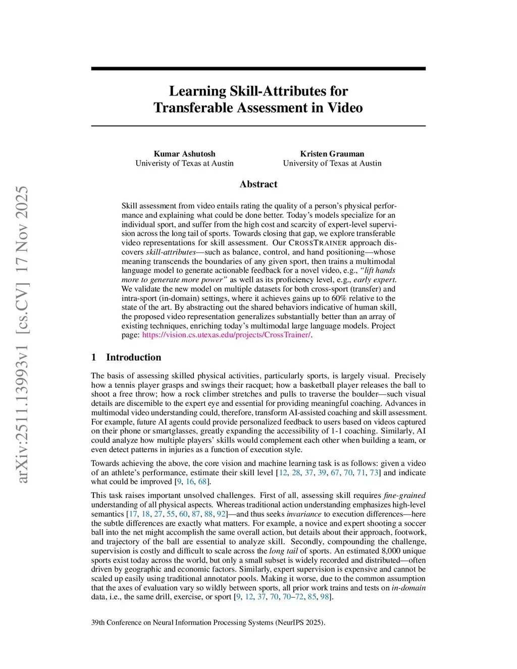 Skill assessment from video entails rating the quality of a person's physical performance and explaining what could be done better. Today's models specialize for an individual sport, and suffer from the high cost and scarcity of expert-level supervision across the long tail of sports. Towards closing that gap, we explore transferable video representations for skill assessment. Our CrossTrainer approach discovers skill-attributes, such as balance, control, and hand positioning -- whose meaning transcends the boundaries of any given sport, then trains a multimodal language model to generate actionable feedback for a novel video, e.g., "lift hands more to generate more power" as well as its proficiency level, e.g., early expert. We validate the new model on multiple datasets for both cross-sport (transfer) and intra-sport (in-domain) settings, where it achieves gains up to 60% relative to the state of the art. By abstracting out the shared behaviors indicative of human skill, the proposed video representation generalizes substantially better than an array of existing techniques, enriching today's multimodal large language models.