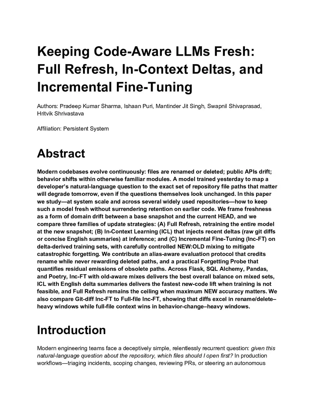 Modern codebases evolve continuously: files are renamed or deleted; public APIs drift; behavior shifts within otherwise familiar modules. A model trained yesterday to map a developer's natural-language question to the exact set of repository file paths that matter will degrade tomorrow, even if the questions themselves look unchanged. In this paper we study, at system scale and across several widely used repositories, how to keep such a model fresh without surrendering retention on earlier code. We frame freshness as a form of domain drift between a base snapshot and the current HEAD, and we compare three families of update strategies: (A) Full Refresh, retraining the entire model at the new snapshot; (B) In-Context Learning (ICL) that injects recent deltas (raw git diffs or concise English summaries) at inference; and (C) Incremental Fine-Tuning (Inc-FT) on delta-derived training sets, with carefully controlled NEW:OLD mixing to mitigate catastrophic forgetting. We contribute an alias-aware evaluation protocol that credits rename while never rewarding deleted paths, and a practical Forgetting Probe that quantifies residual emissions of obsolete paths. Across Flask, SQLAlchemy, Pandas, and Poetry, Inc-FT with old-aware mixes delivers the best overall balance on mixed sets, ICL with English delta summaries delivers the fastest new-code lift when training is not feasible, and Full Refresh remains the ceiling when maximum NEW accuracy matters. We also compare Git-diff Inc-FT to full-file Inc-FT, showing that diffs excel in rename/delete-heavy windows while full-file context wins in behavior-change-heavy windows.