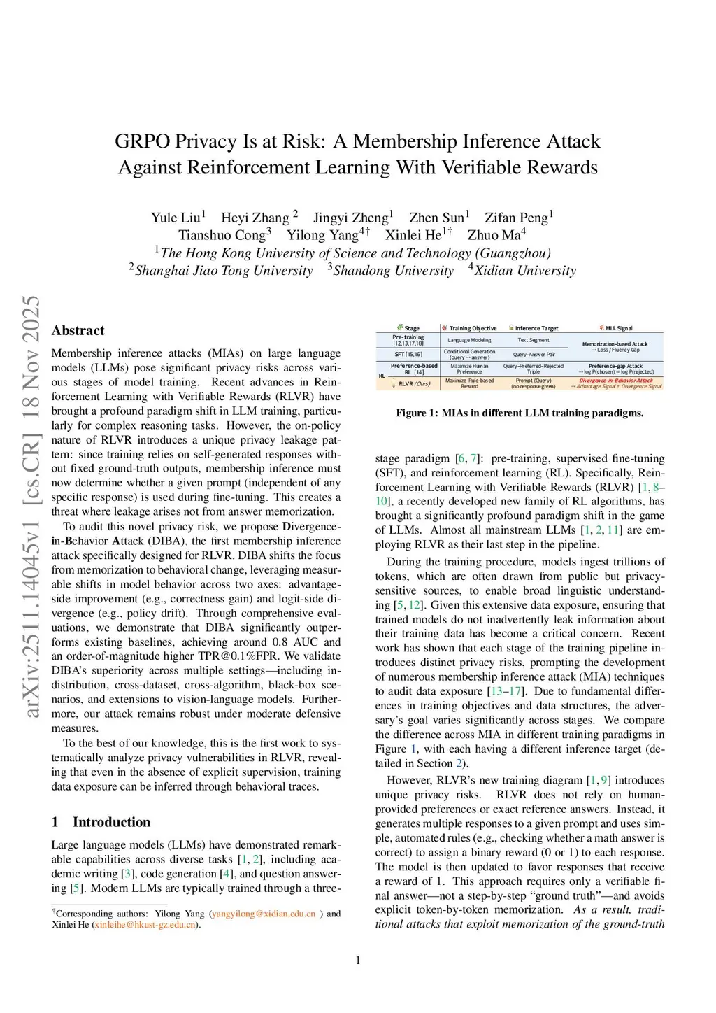Membership inference attacks (MIAs) on large language models (LLMs) pose significant privacy risks across various stages of model training. Recent advances in Reinforcement Learning with Verifiable Rewards (RLVR) have brought a profound paradigm shift in LLM training, particularly for complex reasoning tasks. However, the on-policy nature of RLVR introduces a unique privacy leakage pattern: since training relies on self-generated responses without fixed ground-truth outputs, membership inference must now determine whether a given prompt (independent of any specific response) is used during fine-tuning. This creates a threat where leakage arises not from answer memorization.To audit this novel privacy risk, we propose Divergence-in-Behavior Attack (DIBA), the first membership inference framework specifically designed for RLVR. DIBA shifts the focus from memorization to behavioral change, leveraging measurable shifts in model behavior across two axes: advantage-side improvement (e.g., correctness gain) and logit-side divergence (e.g., policy drift). Through comprehensive evaluations, we demonstrate that DIBA significantly outperforms existing baselines, achieving around 0.8 AUC and an order-of-magnitude higher TPR@0.1%FPR. We validate DIBA's superiority across multiple settings--including in-distribution, cross-dataset, cross-algorithm, black-box scenarios, and extensions to vision-language models. Furthermore, our attack remains robust under moderate defensive measures.To the best of our knowledge, this is the first work to systematically analyze privacy vulnerabilities in RLVR, revealing that even in the absence of explicit supervision, training data exposure can be reliably inferred through behavioral traces.