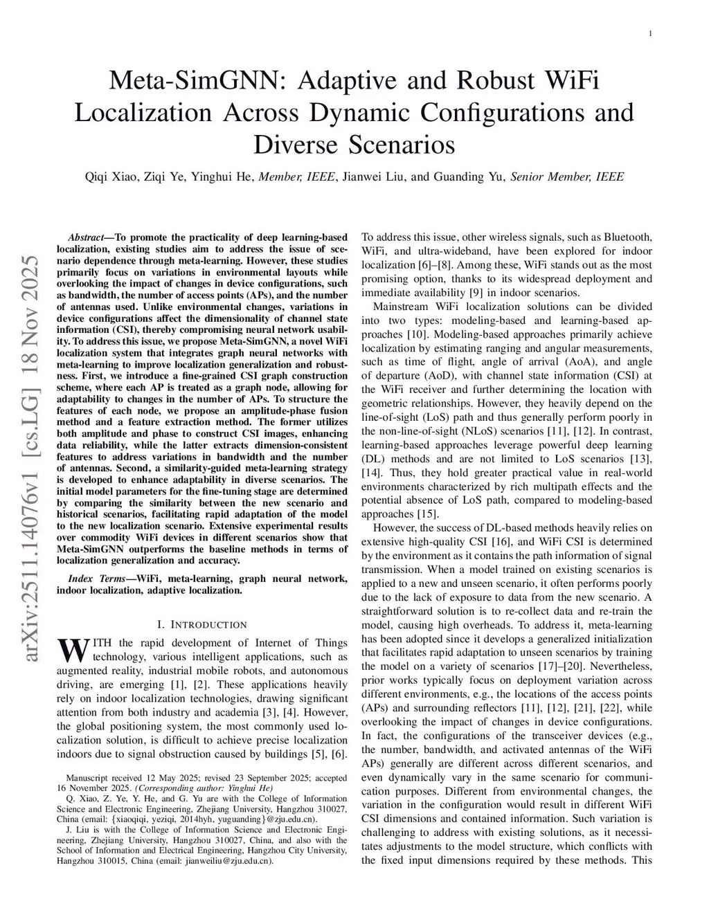 To promote the practicality of deep learning-based localization, existing studies aim to address the issue of scenario dependence through meta-learning. However, these studies primarily focus on variations in environmental layouts while overlooking the impact of changes in device configurations, such as bandwidth, the number of access points (APs), and the number of antennas used. Unlike environmental changes, variations in device configurations affect the dimensionality of channel state information (CSI), thereby compromising neural network usability. To address this issue, we propose Meta-SimGNN, a novel WiFi localization system that integrates graph neural networks with meta-learning to improve localization generalization and robustness. First, we introduce a fine-grained CSI graph construction scheme, where each AP is treated as a graph node, allowing for adaptability to changes in the number of APs. To structure the features of each node, we propose an amplitude-phase fusion method and a feature extraction method. The former utilizes both amplitude and phase to construct CSI images, enhancing data reliability, while the latter extracts dimension-consistent features to address variations in bandwidth and the number of antennas. Second, a similarity-guided meta-learning strategy is developed to enhance adaptability in diverse scenarios. The initial model parameters for the fine-tuning stage are determined by comparing the similarity between the new scenario and historical scenarios, facilitating rapid adaptation of the model to the new localization scenario. Extensive experimental results over commodity WiFi devices in different scenarios show that Meta-SimGNN outperforms the baseline methods in terms of localization generalization and accuracy.