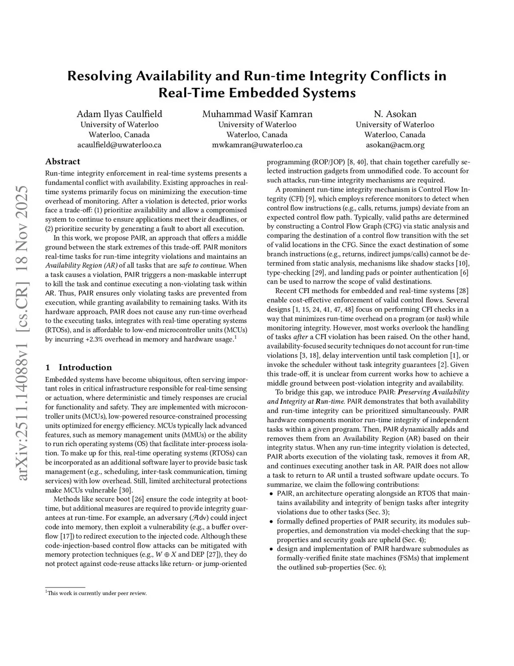 Run-time integrity enforcement in real-time systems presents a fundamental conflict with availability. Existing approaches in real-time systems primarily focus on minimizing the execution-time overhead of monitoring. After a violation is detected, prior works face a trade-off: (1) prioritize availability and allow a compromised system to continue to ensure applications meet their deadlines, or (2) prioritize security by generating a fault to abort all execution. In this work, we propose PAIR, an approach that offers a middle ground between the stark extremes of this trade-off. PAIR monitors real-time tasks for run-time integrity violations and maintains an Availability Region (AR) of all tasks that are safe to continue. When a task causes a violation, PAIR triggers a non-maskable interrupt to kill the task and continue executing a non-violating task within AR. Thus, PAIR ensures only violating tasks are prevented from execution, while granting availability to remaining tasks. With its hardware approach, PAIR does not cause any run-time overhead to the executing tasks, integrates with real-time operating systems (RTOSs), and is affordable to low-end microcontroller units (MCUs) by incurring +2.3% overhead in memory and hardware usage.