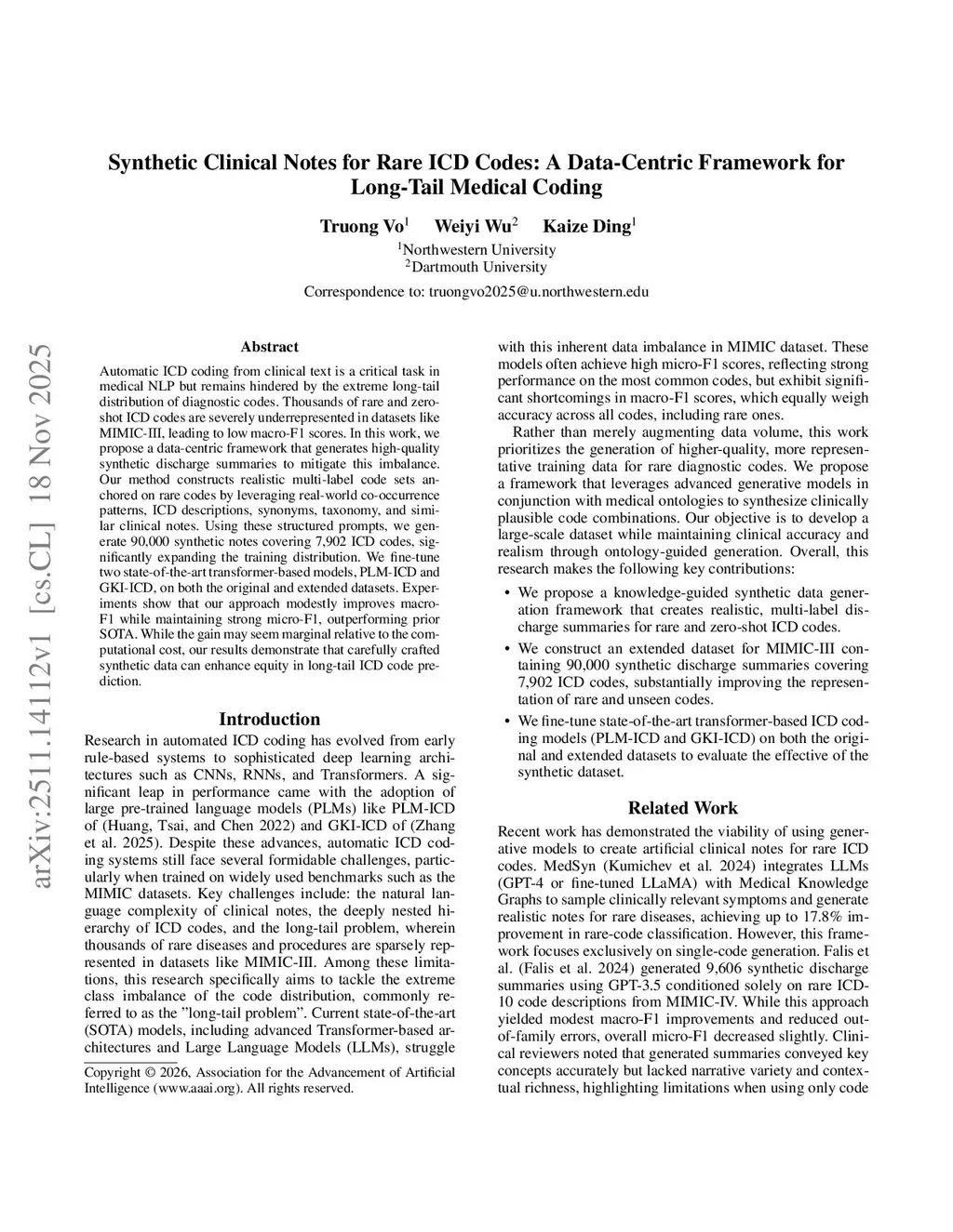 Automatic ICD coding from clinical text is a critical task in medical NLP but remains hindered by the extreme long-tail distribution of diagnostic codes. Thousands of rare and zero-shot ICD codes are severely underrepresented in datasets like MIMIC-III, leading to low macro-F1 scores. In this work, we propose a data-centric framework that generates high-quality synthetic discharge summaries to mitigate this imbalance. Our method constructs realistic multi-label code sets anchored on rare codes by leveraging real-world co-occurrence patterns, ICD descriptions, synonyms, taxonomy, and similar clinical notes. Using these structured prompts, we generate 90,000 synthetic notes covering 7,902 ICD codes, significantly expanding the training distribution. We fine-tune two state-of-the-art transformer-based models, PLM-ICD and GKI-ICD, on both the original and extended datasets. Experiments show that our approach modestly improves macro-F1 while maintaining strong micro-F1, outperforming prior SOTA. While the gain may seem marginal relative to the computational cost, our results demonstrate that carefully crafted synthetic data can enhance equity in long-tail ICD code prediction.