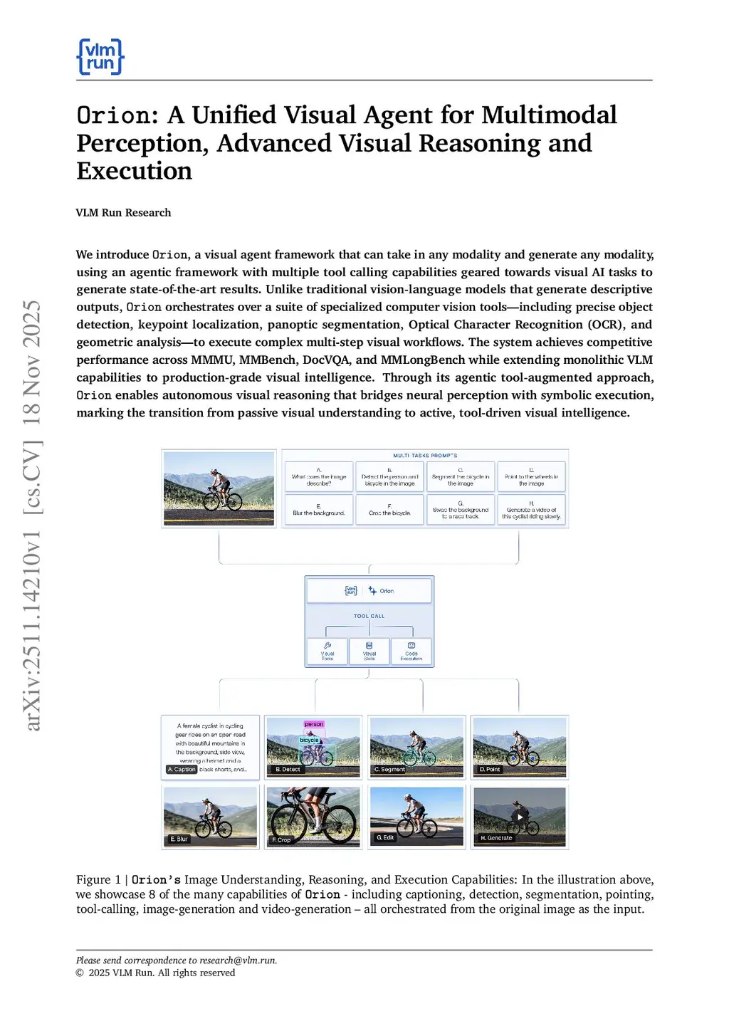 We introduce Orion, a visual agent framework that can take in any modality and generate any modality. Using an agentic framework with multiple tool-calling capabilities, Orion is designed for visual AI tasks and achieves state-of-the-art results. Unlike traditional vision-language models that produce descriptive outputs, Orion orchestrates a suite of specialized computer vision tools, including object detection, keypoint localization, panoptic segmentation, Optical Character Recognition, and geometric analysis, to execute complex multi-step visual workflows. The system achieves competitive performance on MMMU, MMBench, DocVQA, and MMLongBench while extending monolithic vision-language models to production-grade visual intelligence. By combining neural perception with symbolic execution, Orion enables autonomous visual reasoning, marking a transition from passive visual understanding to active, tool-driven visual intelligence.