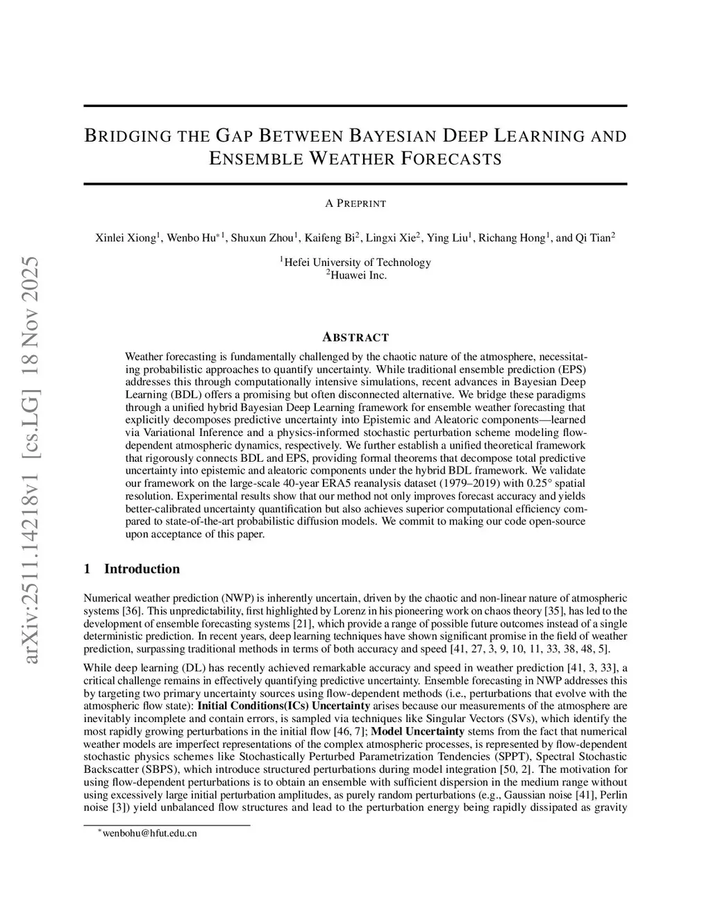 Weather forecasting is fundamentally challenged by the chaotic nature of the atmosphere, necessitating probabilistic approaches to quantify uncertainty. While traditional ensemble prediction (EPS) addresses this through computationally intensive simulations, recent advances in Bayesian Deep Learning (BDL) offer a promising but often disconnected alternative. We bridge these paradigms through a unified hybrid Bayesian Deep Learning framework for ensemble weather forecasting that explicitly decomposes predictive uncertainty into epistemic and aleatoric components, learned via variational inference and a physics-informed stochastic perturbation scheme modeling flow-dependent atmospheric dynamics, respectively. We further establish a unified theoretical framework that rigorously connects BDL and EPS, providing formal theorems that decompose total predictive uncertainty into epistemic and aleatoric components under the hybrid BDL framework. We validate our framework on the large-scale 40-year ERA5 reanalysis dataset (1979-2019) with 0.25° spatial resolution. Experimental results show that our method not only improves forecast accuracy and yields better-calibrated uncertainty quantification but also achieves superior computational efficiency compared to state-of-the-art probabilistic diffusion models. We commit to making our code open-source upon acceptance of this paper.