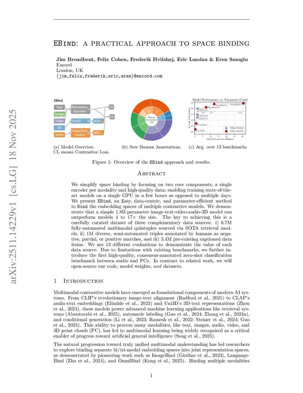 We simplify space binding by focusing on two core components, a single encoder per modality and high-quality data; enabling training state-of-the-art models on a single GPU in a few hours as opposed to multiple days. We present EBind, an Easy, data-centric, and parameter-efficient method to Bind the embedding spaces of multiple contrastive models. We demonstrate that a simple 1.8B-parameter image-text-video-audio-3D model can outperform models 4 to 17x the size. The key to achieving this is a carefully curated dataset of three complementary data sources: i) 6.7M fully-automated multimodal quintuples sourced via SOTA retrieval models, ii) 1M diverse, semi-automated triples annotated by humans as negative, partial, or positive matches, and iii) 3.4M pre-existing captioned data items. We use 13 different evaluations to demonstrate the value of each data source. Due to limitations with existing benchmarks, we further introduce the first high-quality, consensus-annotated zero-shot classification benchmark between audio and PCs. In contrast to related work, we will open-source our code, model weights, and datasets.