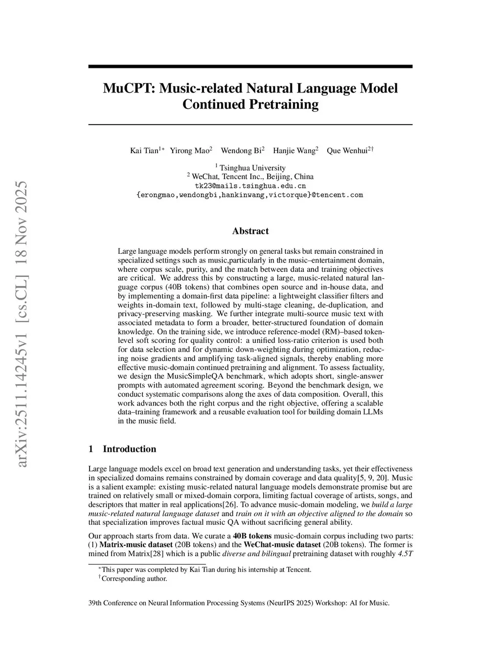 Large language models perform strongly on general tasks but remain constrained in specialized settings such as music, particularly in the music-entertainment domain, where corpus scale, purity, and the match between data and training objectives are critical. We address this by constructing a large, music-related natural language corpus (40B tokens) that combines open source and in-house data, and by implementing a domain-first data pipeline: a lightweight classifier filters and weights in-domain text, followed by multi-stage cleaning, de-duplication, and privacy-preserving masking. We further integrate multi-source music text with associated metadata to form a broader, better-structured foundation of domain knowledge. On the training side, we introduce reference-model (RM)-based token-level soft scoring for quality control: a unified loss-ratio criterion is used both for data selection and for dynamic down-weighting during optimization, reducing noise gradients and amplifying task-aligned signals, thereby enabling more effective music-domain continued pretraining and alignment. To assess factuality, we design the MusicSimpleQA benchmark, which adopts short, single-answer prompts with automated agreement scoring. Beyond the benchmark design, we conduct systematic comparisons along the axes of data composition. Overall, this work advances both the right corpus and the right objective, offering a scalable data-training framework and a reusable evaluation tool for building domain LLMs in the music field.