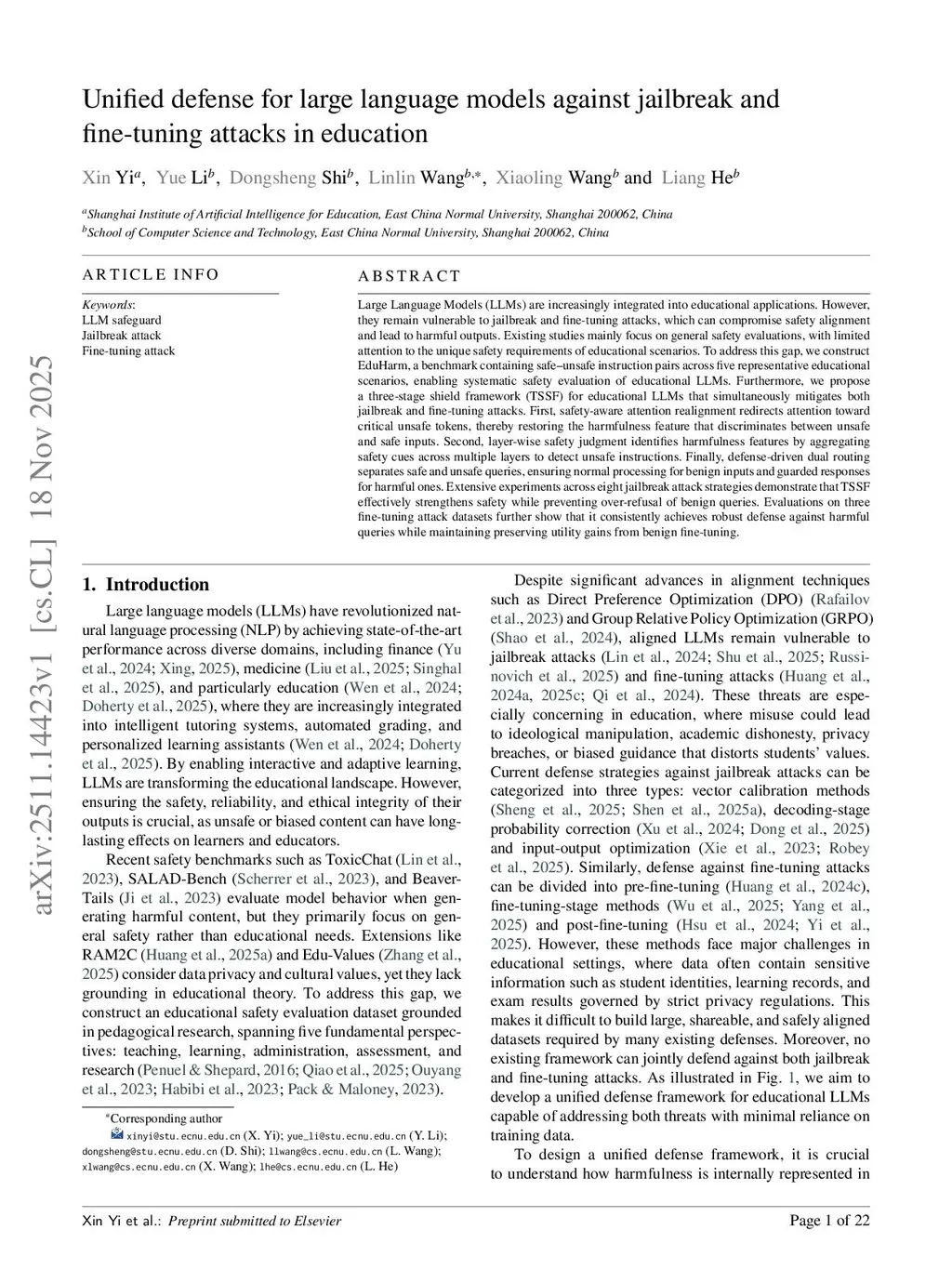 Unified Defense for Large Language Models against Jailbreak and Fine-Tuning Attacks in Education