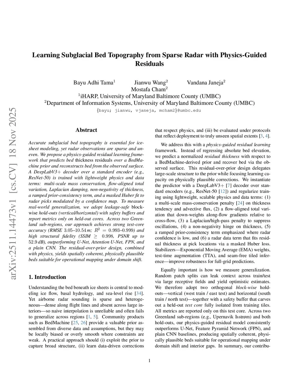 Accurate subglacial bed topography is essential for ice sheet modeling, yet radar observations are sparse and uneven. We propose a physics-guided residual learning framework that predicts bed thickness residuals over a BedMachine prior and reconstructs bed from the observed surface. A DeepLabV3+ decoder over a standard encoder (e.g.,ResNet-50) is trained with lightweight physics and data terms: multi-scale mass conservation, flow-aligned total variation, Laplacian damping, non-negativity of thickness, a ramped prior-consistency term, and a masked Huber fit to radar picks modulated by a confidence map. To measure real-world generalization, we adopt leakage-safe blockwise hold-outs (vertical/horizontal) with safety buffers and report metrics only on held-out cores. Across two Greenland sub-regions, our approach achieves strong test-core accuracy and high structural fidelity, outperforming U-Net, Attention U-Net, FPN, and a plain CNN. The residual-over-prior design, combined with physics, yields spatially coherent, physically plausible beds suitable for operational mapping under domain shift.