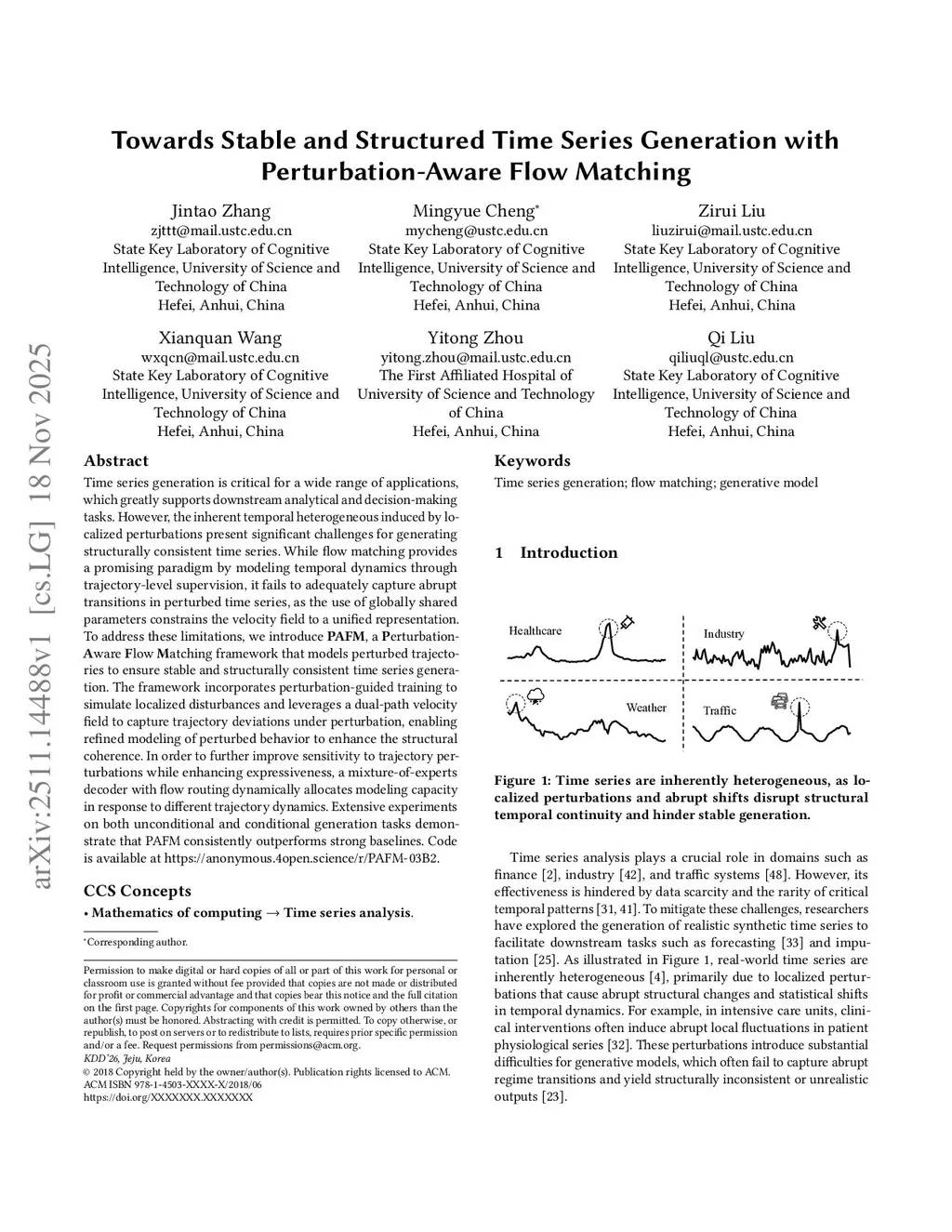 Time series generation is critical for a wide range of applications, which greatly supports downstream analytical and decision-making tasks. However, the inherent temporal heterogeneous induced by localized perturbations present significant challenges for generating structurally consistent time series. While flow matching provides a promising paradigm by modeling temporal dynamics through trajectory-level supervision, it fails to adequately capture abrupt transitions in perturbed time series, as the use of globally shared parameters constrains the velocity field to a unified representation. To address these limitations, we introduce \textbf{PAFM}, a \textbf{P}erturbation-\textbf{A}ware \textbf{F}low \textbf{M}atching framework that models perturbed trajectories to ensure stable and structurally consistent time series generation. The framework incorporates perturbation-guided training to simulate localized disturbances and leverages a dual-path velocity field to capture trajectory deviations under perturbation, enabling refined modeling of perturbed behavior to enhance the structural coherence. In order to further improve sensitivity to trajectory perturbations while enhancing expressiveness, a mixture-of-experts decoder with flow routing dynamically allocates modeling capacity in response to different trajectory dynamics. Extensive experiments on both unconditional and conditional generation tasks demonstrate that PAFM consistently outperforms strong baselines. Code is available atthis https URL.