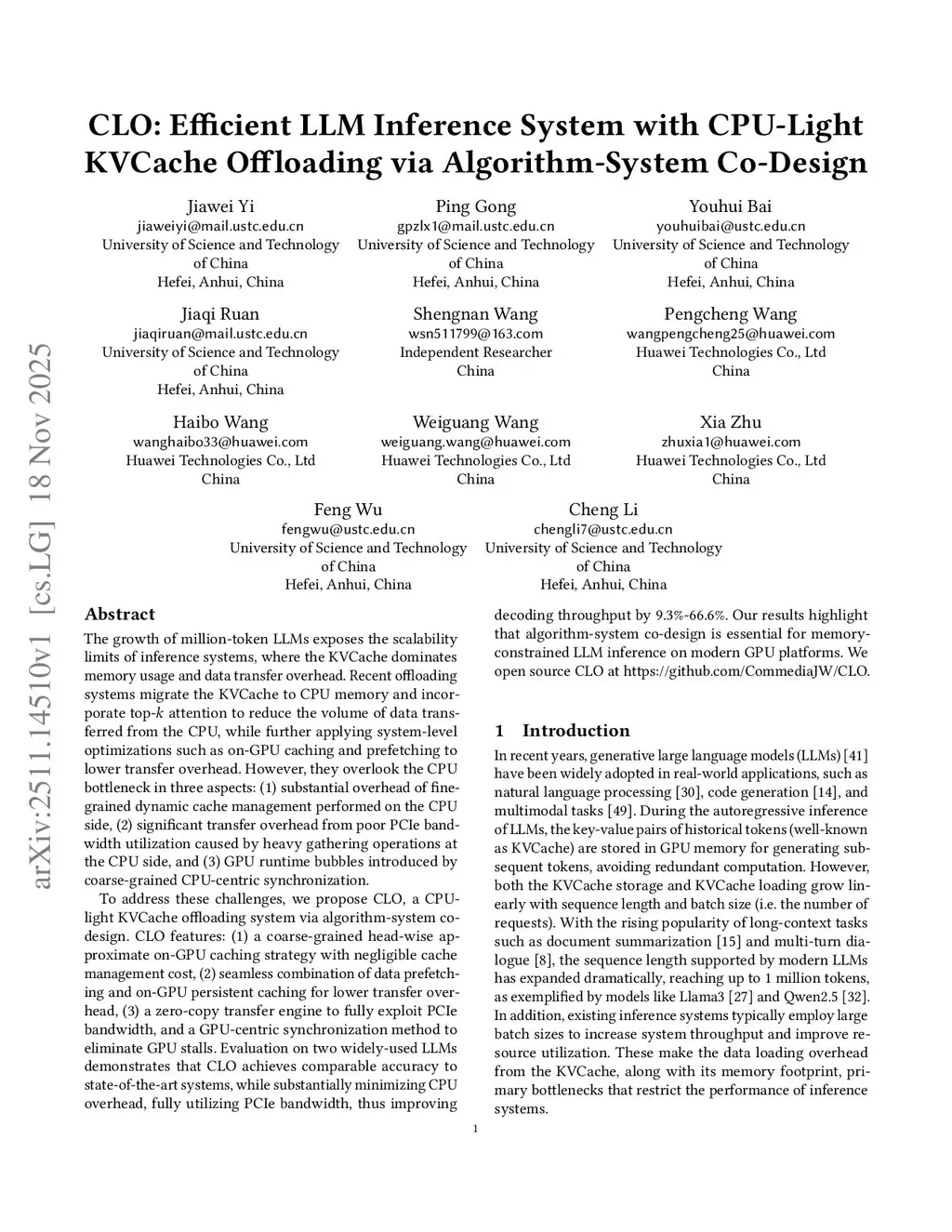 CLO: Efficient LLM Inference System with CPU-Light KVCache Offloading via Algorithm-System Co-Design