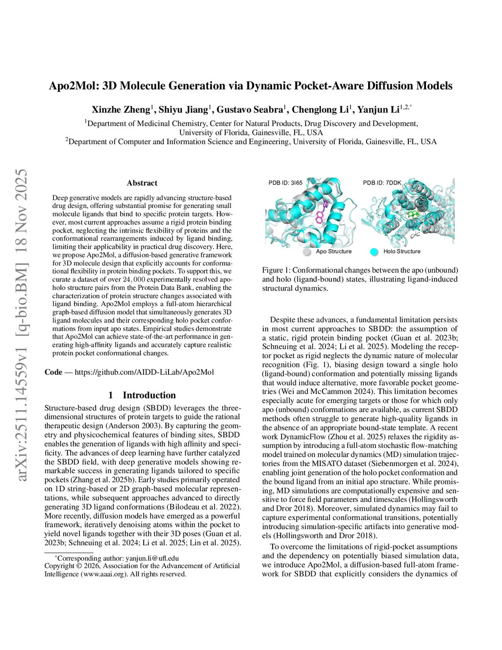 Deep generative models are rapidly advancing structure-based drug design, offering substantial promise for generating small molecule ligands that bind to specific protein targets. However, most current approaches assume a rigid protein binding pocket, neglecting the intrinsic flexibility of proteins and the conformational rearrangements induced by ligand binding, limiting their applicability in practical drug discovery. Here, we propose Apo2Mol, a diffusion-based generative framework for 3D molecule design that explicitly accounts for conformational flexibility in protein binding pockets. To support this, we curate a dataset of over 24,000 experimentally resolved apo-holo structure pairs from the Protein Data Bank, enabling the characterization of protein structure changes associated with ligand binding. Apo2Mol employs a full-atom hierarchical graph-based diffusion model that simultaneously generates 3D ligand molecules and their corresponding holo pocket conformations from input apo states. Empirical studies demonstrate that Apo2Mol can achieve state-of-the-art performance in generating high-affinity ligands and accurately capture realistic protein pocket conformational changes.