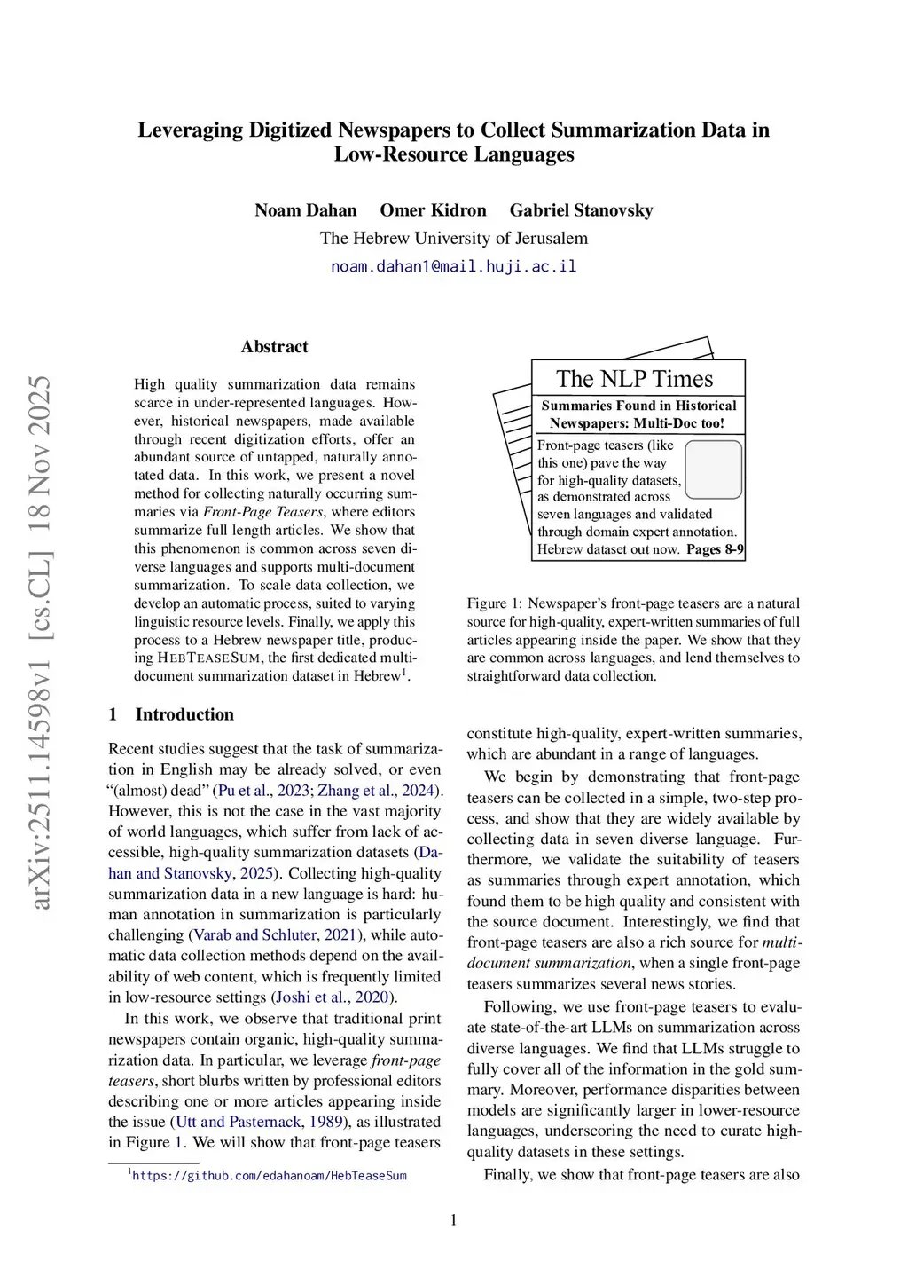High quality summarization data remains scarce in under-represented languages. However, historical newspapers, made available through recent digitization efforts, offer an abundant source of untapped, naturally annotated data. In this work, we present a novel method for collecting naturally occurring summaries via Front-Page Teasers, where editors summarize full length articles. We show that this phenomenon is common across seven diverse languages and supports multi-document summarization. To scale data collection, we develop an automatic process, suited to varying linguistic resource levels. Finally, we apply this process to a Hebrew newspaper title, producing HEBTEASESUM, the first dedicated multi-document summarization dataset in Hebrew.