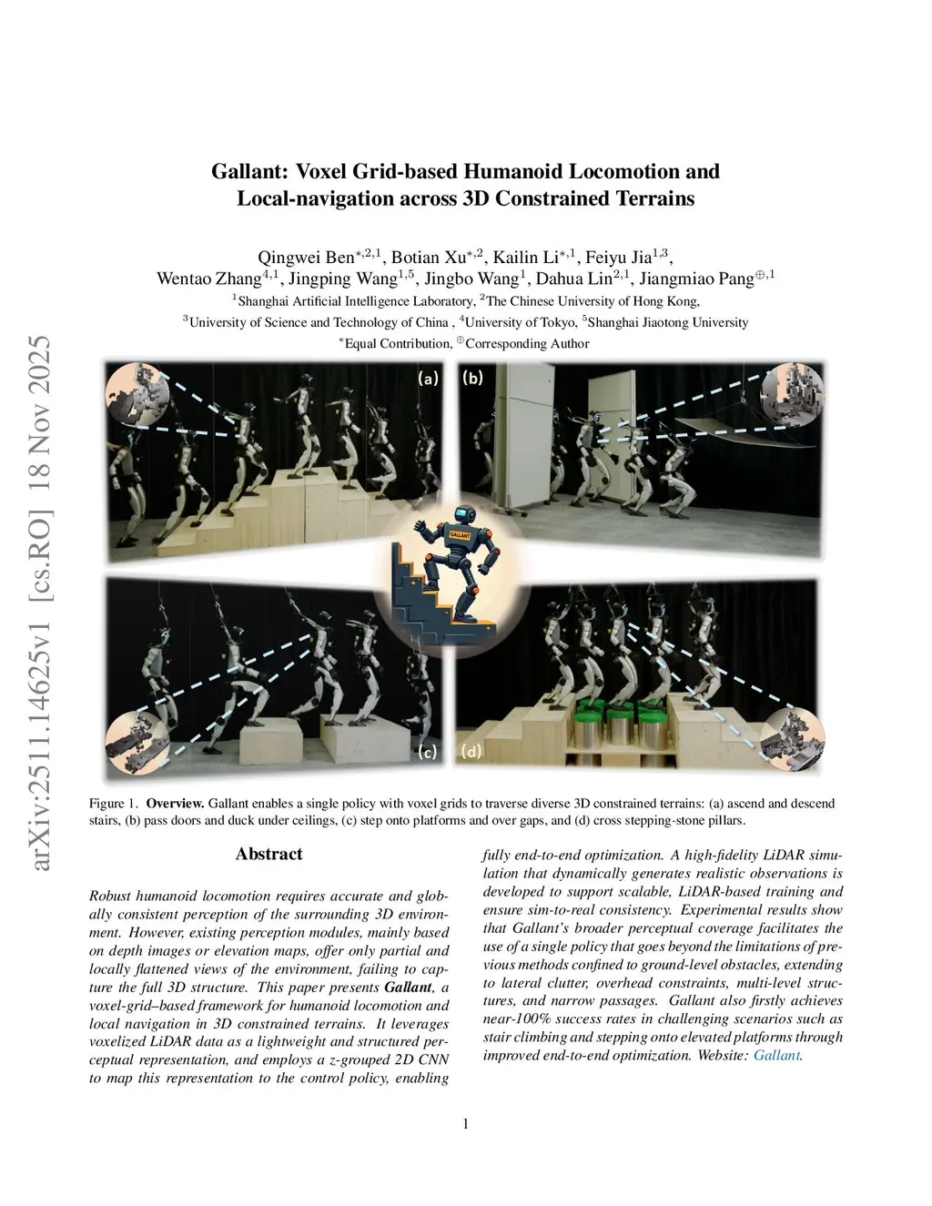 Gallant: Voxel Grid-based Humanoid Locomotion and Local-navigation across 3D Constrained Terrains