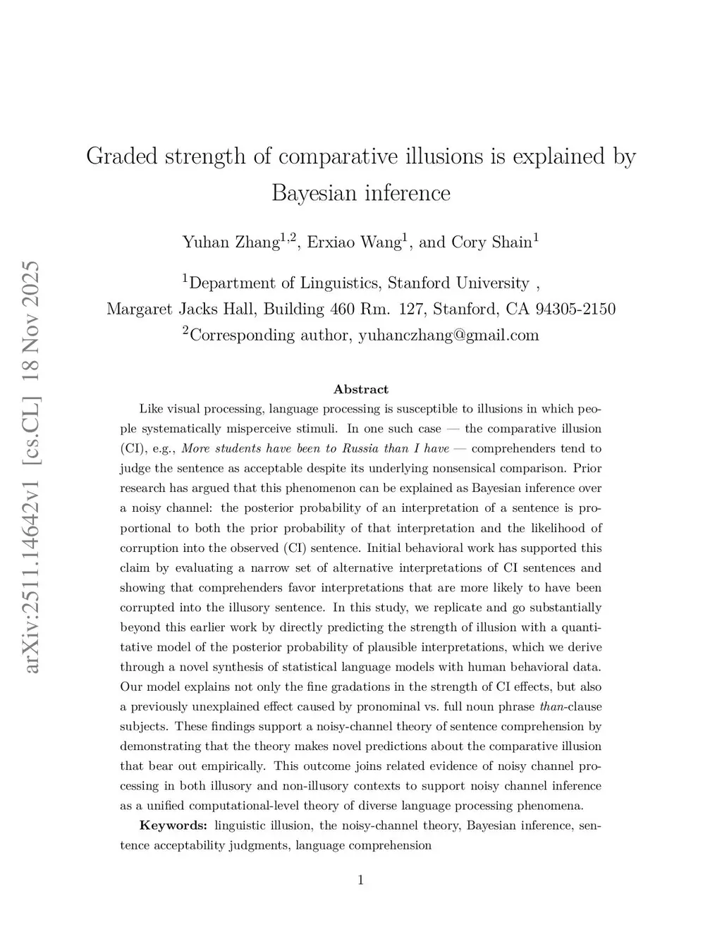 Like visual processing, language processing is susceptible to illusions in which people systematically misperceive stimuli. In one such case--the comparative illusion (CI), e.g., More students have been to Russia than I have--comprehenders tend to judge the sentence as acceptable despite its underlying nonsensical comparison. Prior research has argued that this phenomenon can be explained as Bayesian inference over a noisy channel: the posterior probability of an interpretation of a sentence is proportional to both the prior probability of that interpretation and the likelihood of corruption into the observed (CI) sentence. Initial behavioral work has supported this claim by evaluating a narrow set of alternative interpretations of CI sentences and showing that comprehenders favor interpretations that are more likely to have been corrupted into the illusory sentence. In this study, we replicate and go substantially beyond this earlier work by directly predicting the strength of illusion with a quantitative model of the posterior probability of plausible interpretations, which we derive through a novel synthesis of statistical language models with human behavioral data. Our model explains not only the fine gradations in the strength of CI effects, but also a previously unexplained effect caused by pronominal vs. full noun phrase than-clause subjects. These findings support a noisy-channel theory of sentence comprehension by demonstrating that the theory makes novel predictions about the comparative illusion that bear out empirically. This outcome joins related evidence of noisy channel processing in both illusory and non-illusory contexts to support noisy channel inference as a unified computational-level theory of diverse language processing phenomena.