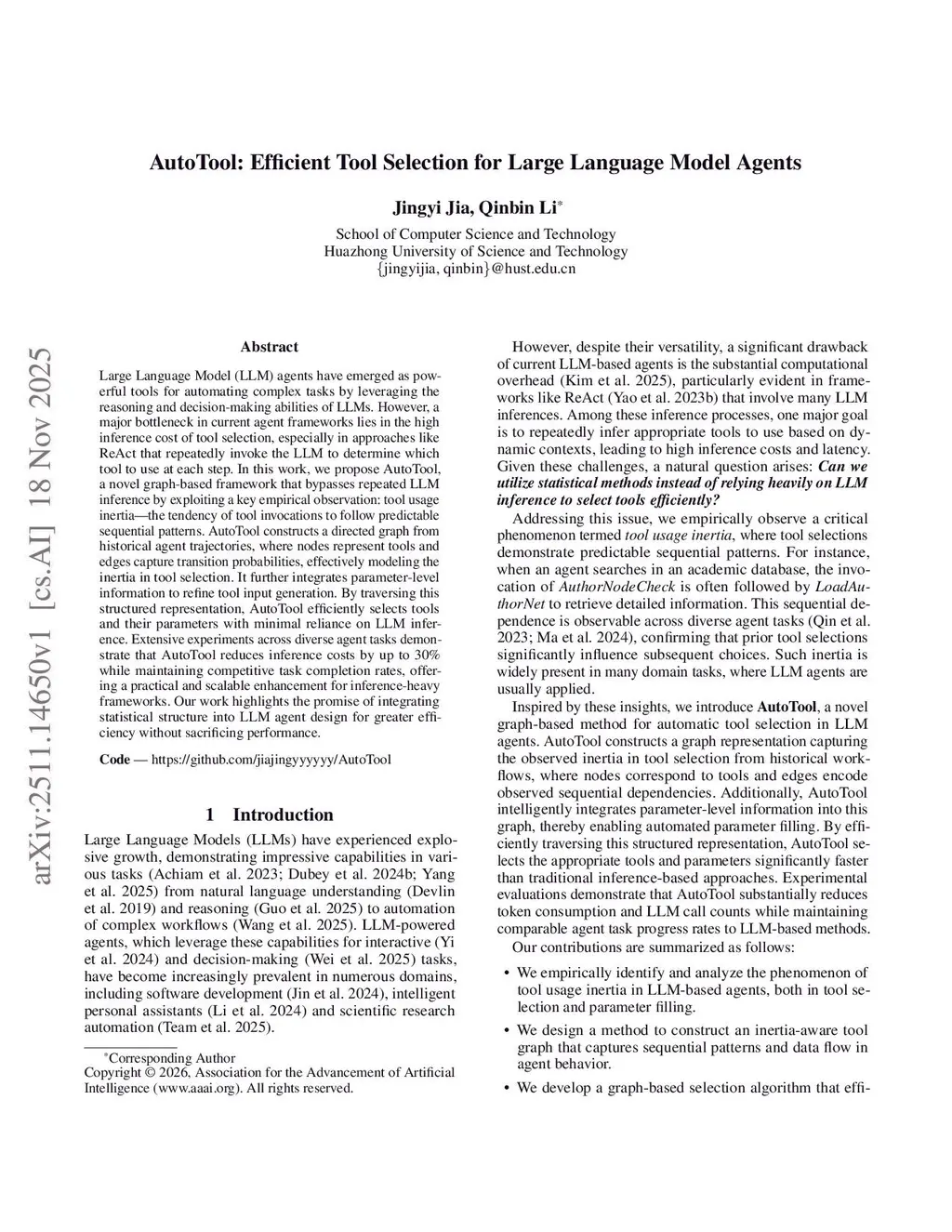 Large Language Model (LLM) agents have emerged as powerful tools for automating complex tasks by leveraging the reasoning and decision-making abilities of LLMs. However, a major bottleneck in current agent frameworks lies in the high inference cost of tool selection, especially in approaches like ReAct that repeatedly invoke the LLM to determine which tool to use at each step. In this work, we propose AutoTool, a novel graph-based framework that bypasses repeated LLM inference by exploiting a key empirical observation: tool usage inertia - the tendency of tool invocations to follow predictable sequential patterns. AutoTool constructs a directed graph from historical agent trajectories, where nodes represent tools and edges capture transition probabilities, effectively modeling the inertia in tool selection. It further integrates parameter-level information to refine tool input generation. By traversing this structured representation, AutoTool efficiently selects tools and their parameters with minimal reliance on LLM inference. Extensive experiments across diverse agent tasks demonstrate that AutoTool reduces inference costs by up to 30% while maintaining competitive task completion rates, offering a practical and scalable enhancement for inference-heavy frameworks. Our work highlights the promise of integrating statistical structure into LLM agent design for greater efficiency without sacrificing performance.