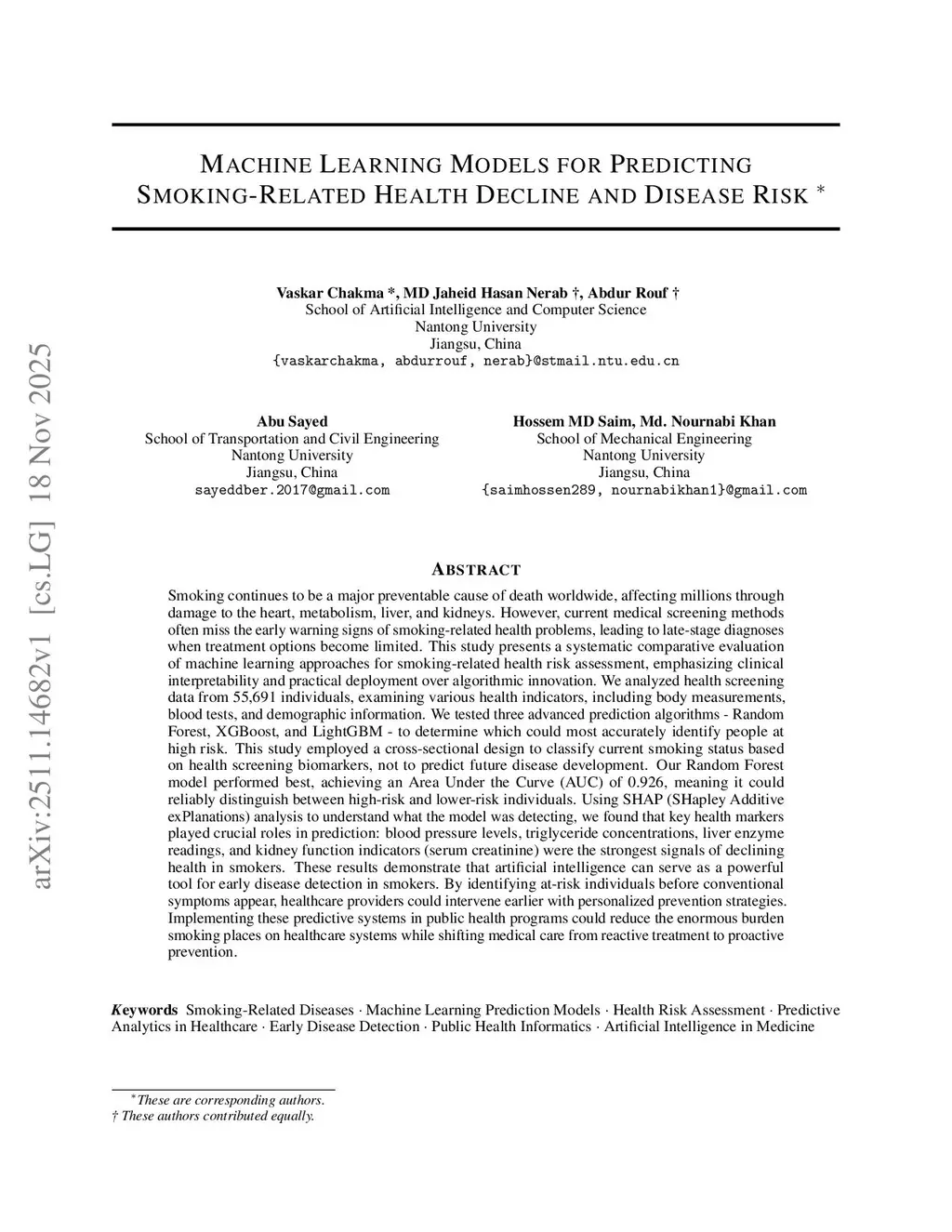 Smoking continues to be a major preventable cause of death worldwide, affecting millions through damage to the heart, metabolism, liver, and kidneys. However, current medical screening methods often miss the early warning signs of smoking-related health problems, leading to late-stage diagnoses when treatment options become limited. This study presents a systematic comparative evaluation of machine learning approaches for smoking-related health risk assessment, emphasizing clinical interpretability and practical deployment over algorithmic innovation. We analyzed health screening data from 55,691 individuals, examining various health indicators, including body measurements, blood tests, and demographic information. We tested three advanced prediction algorithms - Random Forest, XGBoost, and LightGBM - to determine which could most accurately identify people at high risk. This study employed a cross-sectional design to classify current smoking status based on health screening biomarkers, not to predict future disease development. Our Random Forest model performed best, achieving an Area Under the Curve (AUC) of 0.926, meaning it could reliably distinguish between high-risk and lower-risk individuals. Using SHAP (SHapley Additive exPlanations) analysis to understand what the model was detecting, we found that key health markers played crucial roles in prediction: blood pressure levels, triglyceride concentrations, liver enzyme readings, and kidney function indicators (serum creatinine) were the strongest signals of declining health in smokers.