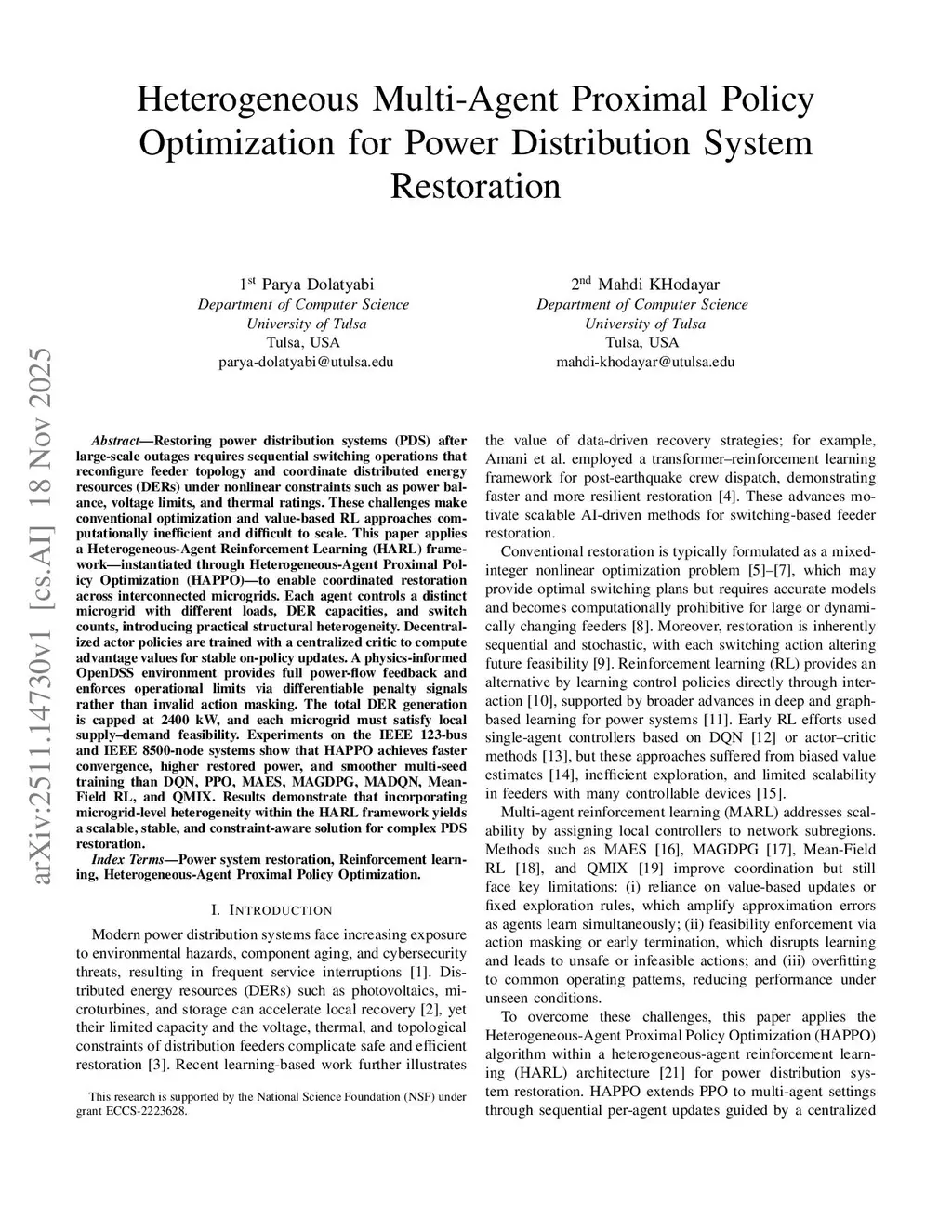 Heterogeneous Multi-Agent Proximal Policy Optimization for Power Distribution System Restoration
