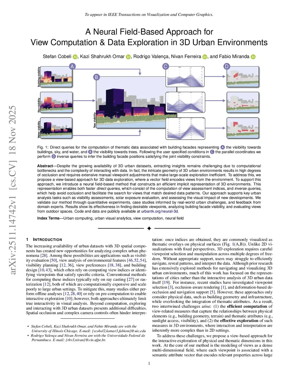A Neural Field-Based Approach for View Computation & Data Exploration in 3D Urban Environments