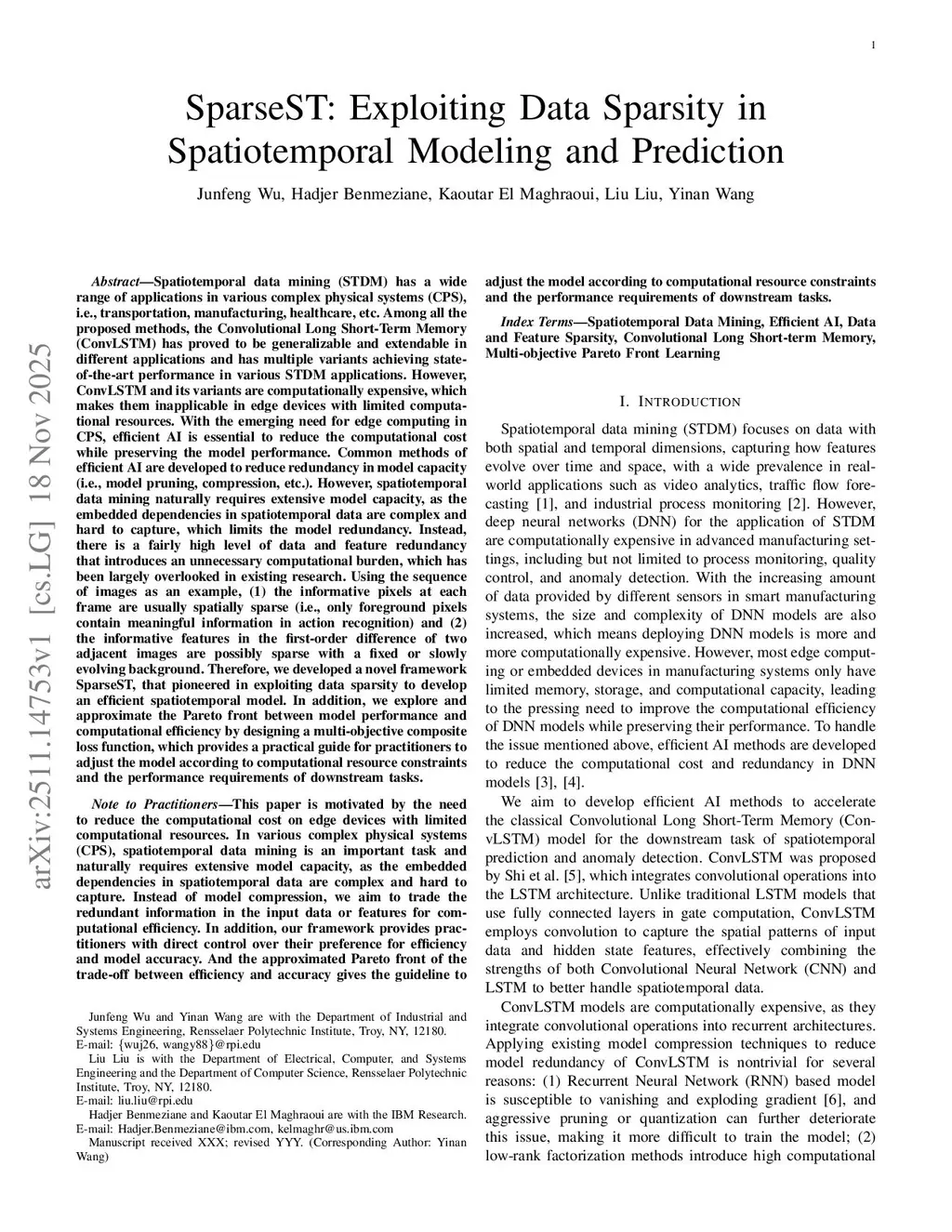 Spatiotemporal data mining (STDM) has a wide range of applications in various complex physical systems (CPS), i.e., transportation, manufacturing, healthcare, etc. Among all the proposed methods, the Convolutional Long Short-Term Memory (ConvLSTM) has proved to be generalizable and extendable in different applications and has multiple variants achieving state-of-the-art performance in various STDM applications. However, ConvLSTM and its variants are computationally expensive, which makes them inapplicable in edge devices with limited computational resources. With the emerging need for edge computing in CPS, efficient AI is essential to reduce the computational cost while preserving the model performance. Common methods of efficient AI are developed to reduce redundancy in model capacity (i.e., model pruning, compression, etc.). However, spatiotemporal data mining naturally requires extensive model capacity, as the embedded dependencies in spatiotemporal data are complex and hard to capture, which limits the model redundancy. Instead, there is a fairly high level of data and feature redundancy that introduces an unnecessary computational burden, which has been largely overlooked in existing research. Therefore, we developed a novel framework SparseST, that pioneered in exploiting data sparsity to develop an efficient spatiotemporal model. In addition, we explore and approximate the Pareto front between model performance and computational efficiency by designing a multi-objective composite loss function, which provides a practical guide for practitioners to adjust the model according to computational resource constraints and the performance requirements of downstream tasks.