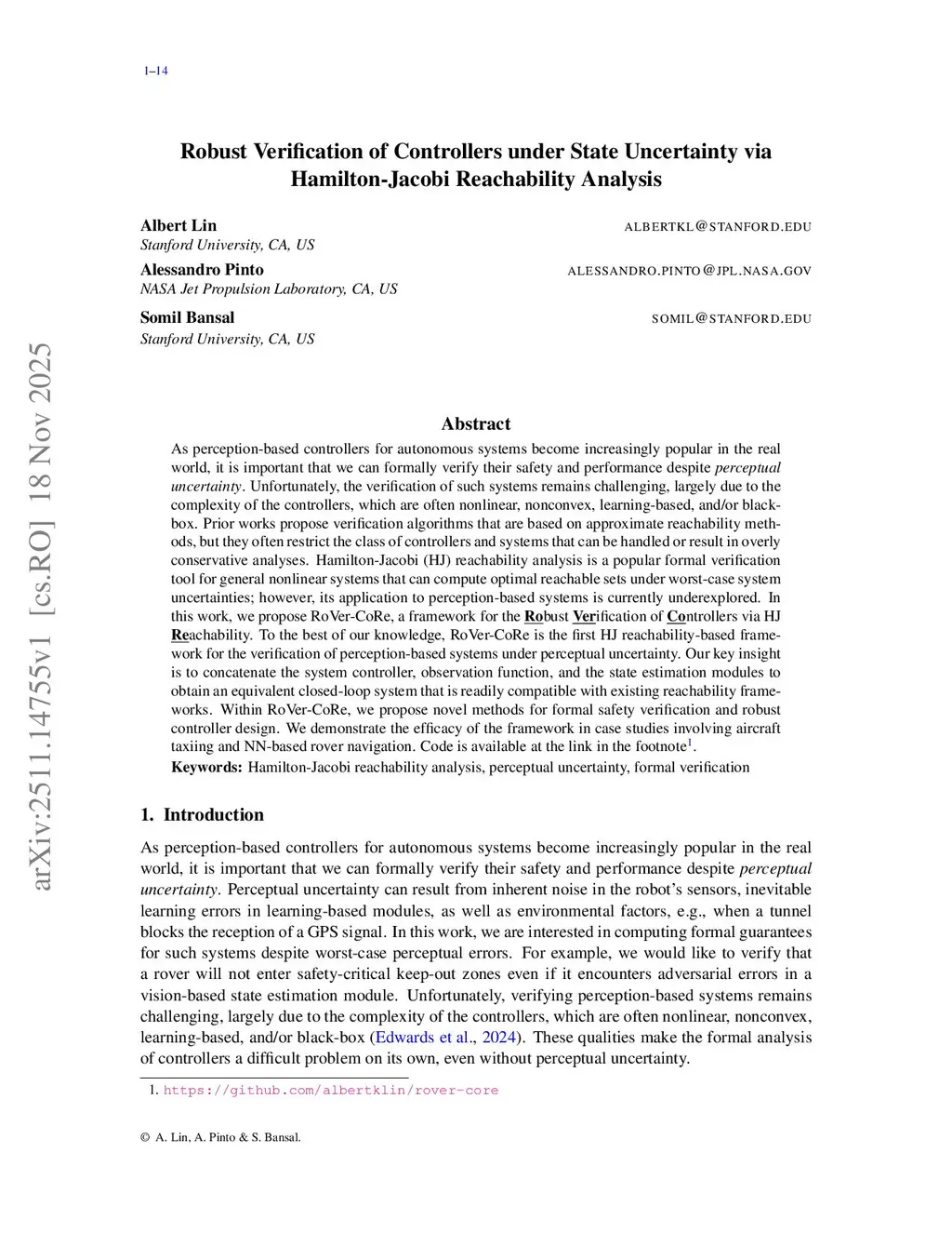As perception-based controllers for autonomous systems become increasingly popular in the real world, it is important that we can formally verify their safety and performance despite perceptual uncertainty. Unfortunately, the verification of such systems remains challenging, largely due to the complexity of the controllers, which are often nonlinear, nonconvex, learning-based, and/or black-box. Prior works propose verification algorithms that are based on approximate reachability methods, but they often restrict the class of controllers and systems that can be handled or result in overly conservative analyses. Hamilton-Jacobi (HJ) reachability analysis is a popular formal verification tool for general nonlinear systems that can compute optimal reachable sets under worst-case system uncertainties; however, its application to perception-based systems is currently underexplored. In this work, we propose RoVer-CoRe, a framework for the Robust Verification of Controllers via HJ Reachability. To the best of our knowledge, RoVer-CoRe is the first HJ reachability-based framework for the verification of perception-based systems under perceptual uncertainty. Our key insight is to concatenate the system controller, observation function, and the state estimation modules to obtain an equivalent closed-loop system that is readily compatible with existing reachability frameworks. Within RoVer-CoRe, we propose novel methods for formal safety verification and robust controller design. We demonstrate the efficacy of the framework in case studies involving aircraft taxiing and NN-based rover navigation. Code is available at the link in the footnote.