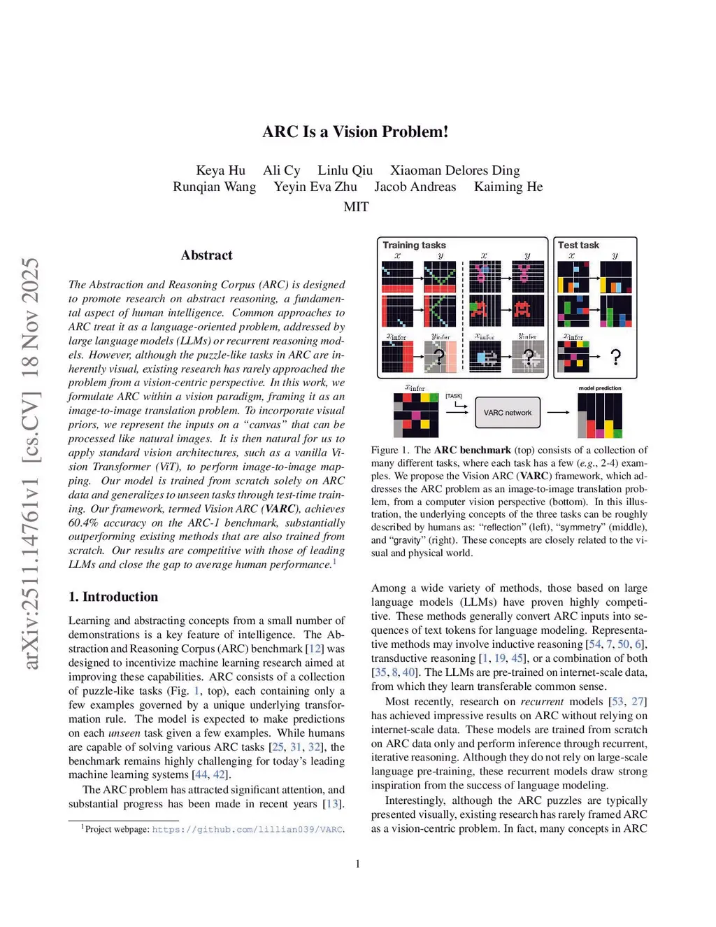 The Abstraction and Reasoning Corpus (ARC) is designed to promote research on abstract reasoning, a fundamental aspect of human intelligence. Common approaches to ARC treat it as a language-oriented problem, addressed by large language models (LLMs) or recurrent reasoning models. However, although the puzzle-like tasks in ARC are inherently visual, existing research has rarely approached the problem from a vision-centric perspective. In this work, we formulate ARC within a vision paradigm, framing it as an image-to-image translation problem. To incorporate visual priors, we represent the inputs on a "canvas" that can be processed like natural images. It is then natural for us to apply standard vision architectures, such as a vanilla Vision Transformer (ViT), to perform image-to-image mapping. Our model is trained from scratch solely on ARC data and generalizes to unseen tasks through test-time training. Our framework, termed Vision ARC (VARC), achieves 60.4% accuracy on the ARC-1 benchmark, substantially outperforming existing methods that are also trained from scratch. Our results are competitive with those of leading LLMs and close the gap to average human performance.
