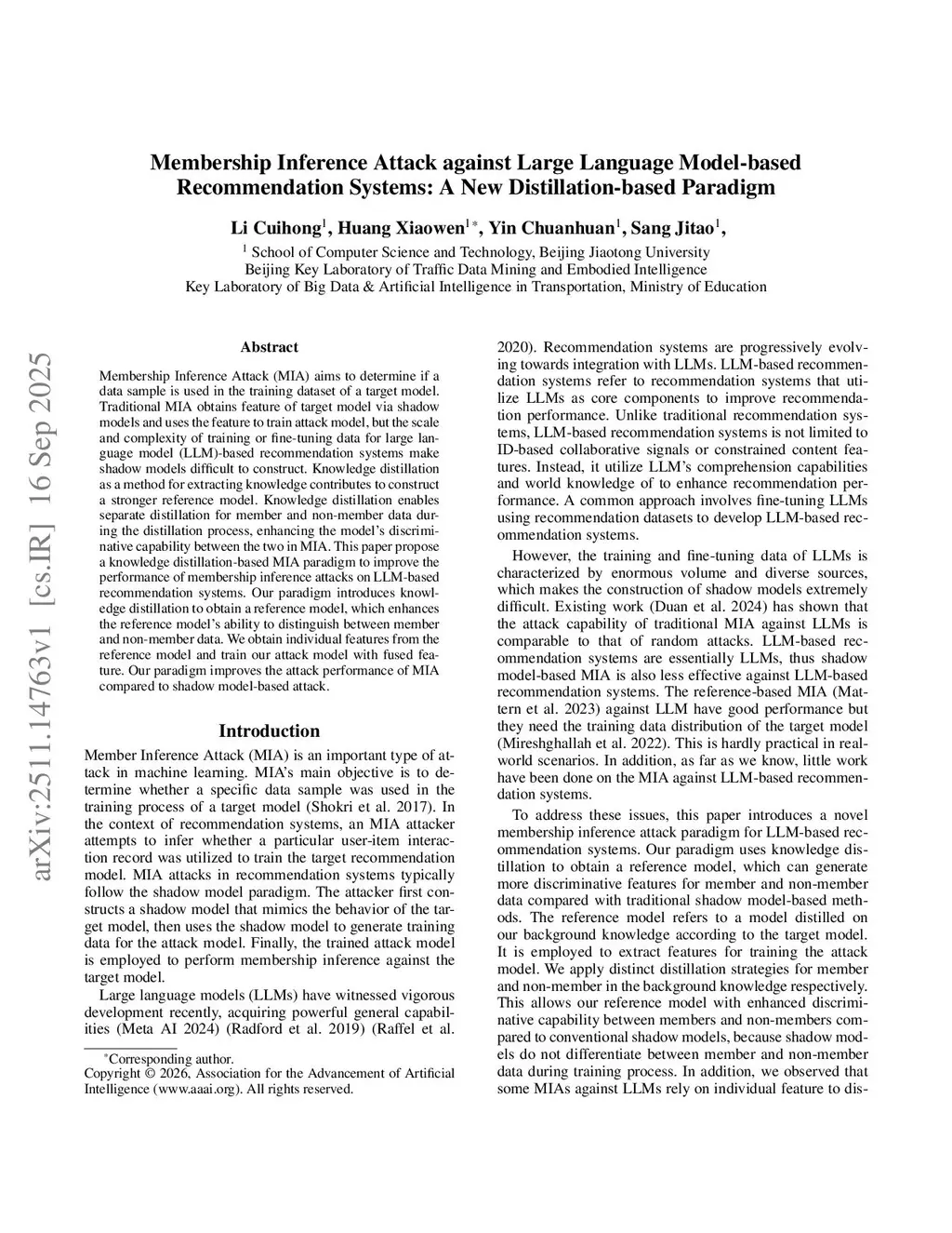 Membership Inference Attack (MIA) aims to determine if a data sample is used in the training dataset of a target model. Traditional MIA obtains feature of target model via shadow models and uses the feature to train attack model, but the scale and complexity of training or fine-tuning data for large language model (LLM)-based recommendation systems make shadow models difficult to construct. Knowledge distillation as a method for extracting knowledge contributes to construct a stronger reference model. Knowledge distillation enables separate distillation for member and non-member data during the distillation process, enhancing the model's discriminative capability between the two in MIA. This paper propose a knowledge distillation-based MIA paradigm to improve the performance of membership inference attacks on LLM-based recommendation systems. Our paradigm introduces knowledge distillation to obtain a reference model, which enhances the reference model's ability to distinguish between member and non-member data. We obtain individual features from the reference model and train our attack model with fused feature. Our paradigm improves the attack performance of MIA compared to shadow model-based attack.