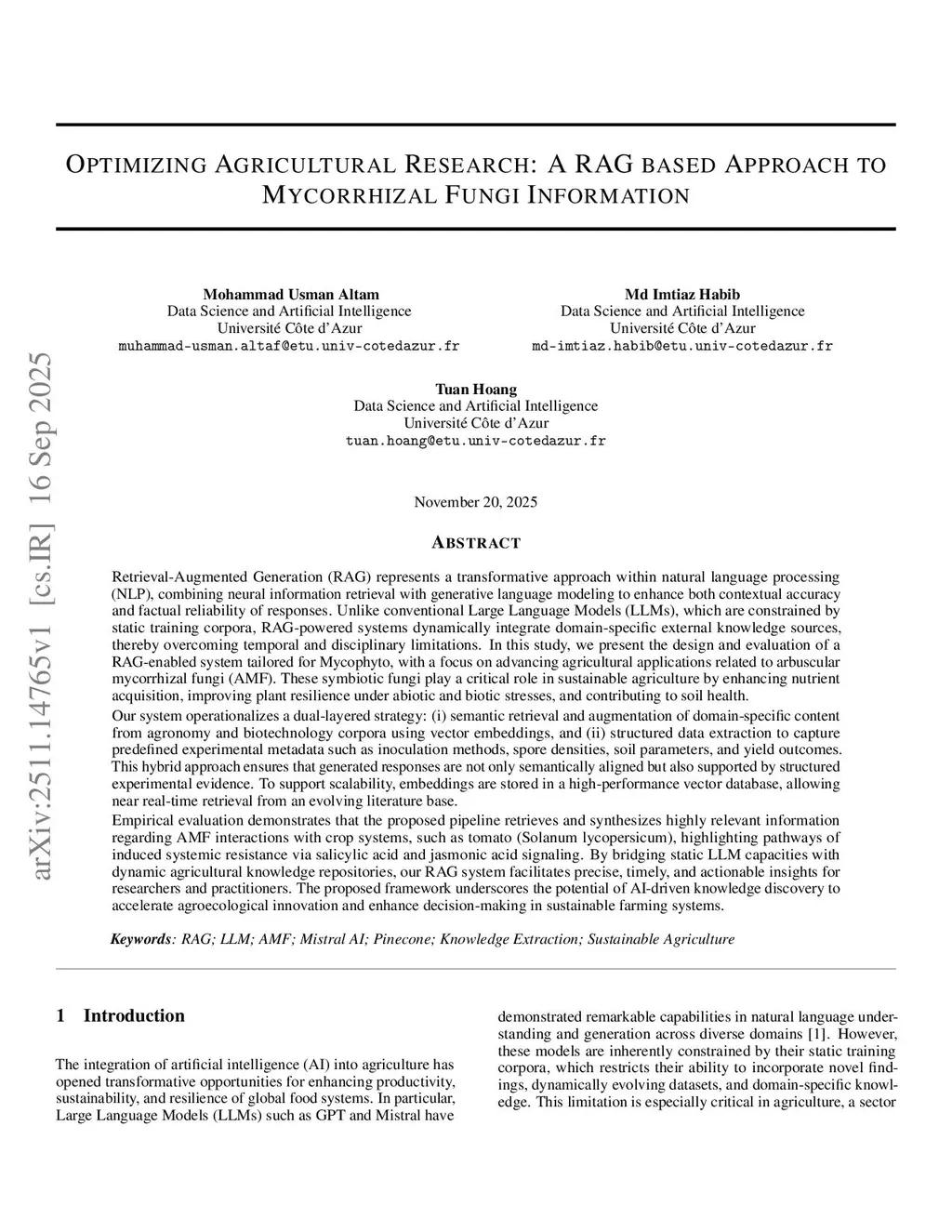Retrieval-Augmented Generation (RAG) represents a transformative approach within natural language processing (NLP), combining neural information retrieval with generative language modeling to enhance both contextual accuracy and factual reliability of responses. Unlike conventional Large Language Models (LLMs), which are constrained by static training corpora, RAG-powered systems dynamically integrate domain-specific external knowledge sources, thereby overcoming temporal and disciplinary limitations. In this study, we present the design and evaluation of a RAG-enabled system tailored for Mycophyto, with a focus on advancing agricultural applications related to arbuscular mycorrhizal fungi (AMF). These fungi play a critical role in sustainable agriculture by enhancing nutrient acquisition, improving plant resilience under abiotic and biotic stresses, and contributing to soil health. Our system operationalizes a dual-layered strategy: (i) semantic retrieval and augmentation of domain-specific content from agronomy and biotechnology corpora using vector embeddings, and (ii) structured data extraction to capture predefined experimental metadata such as inoculation methods, spore densities, soil parameters, and yield outcomes. This hybrid approach ensures that generated responses are not only semantically aligned but also supported by structured experimental evidence. To support scalability, embeddings are stored in a high-performance vector database, allowing near real-time retrieval from an evolving literature base. Empirical evaluation demonstrates that the proposed pipeline retrieves and synthesizes highly relevant information regarding AMF interactions with crop systems, such as tomato (Solanum lycopersicum). The framework underscores the potential of AI-driven knowledge discovery to accelerate agroecological innovation and enhance decision-making in sustainable farming systems.