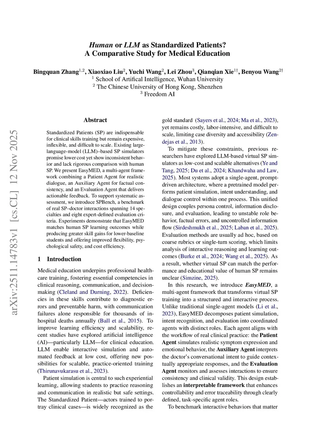 Standardized patients (SPs) are indispensable for clinical skills training but remain expensive and difficult to scale. Although large language model (LLM)-based virtual standardized patients (VSPs) have been proposed as an alternative, their behavior remains unstable and lacks rigorous comparison with human standardized patients. We propose EasyMED, a multi-agent VSP framework that separates case-grounded information disclosure from response generation to support stable, inquiry-conditioned patient behavior. We also introduce SPBench, a human-grounded benchmark with eight expert-defined criteria for interaction-level evaluation. Experiments show that EasyMED more closely matches human SP behavior than existing VSPs, particularly in case consistency and controlled disclosure. A four-week controlled study further demonstrates learning outcomes comparable to human SP training, with stronger early gains for novice learners and improved flexibility, psychological safety, and cost efficiency.