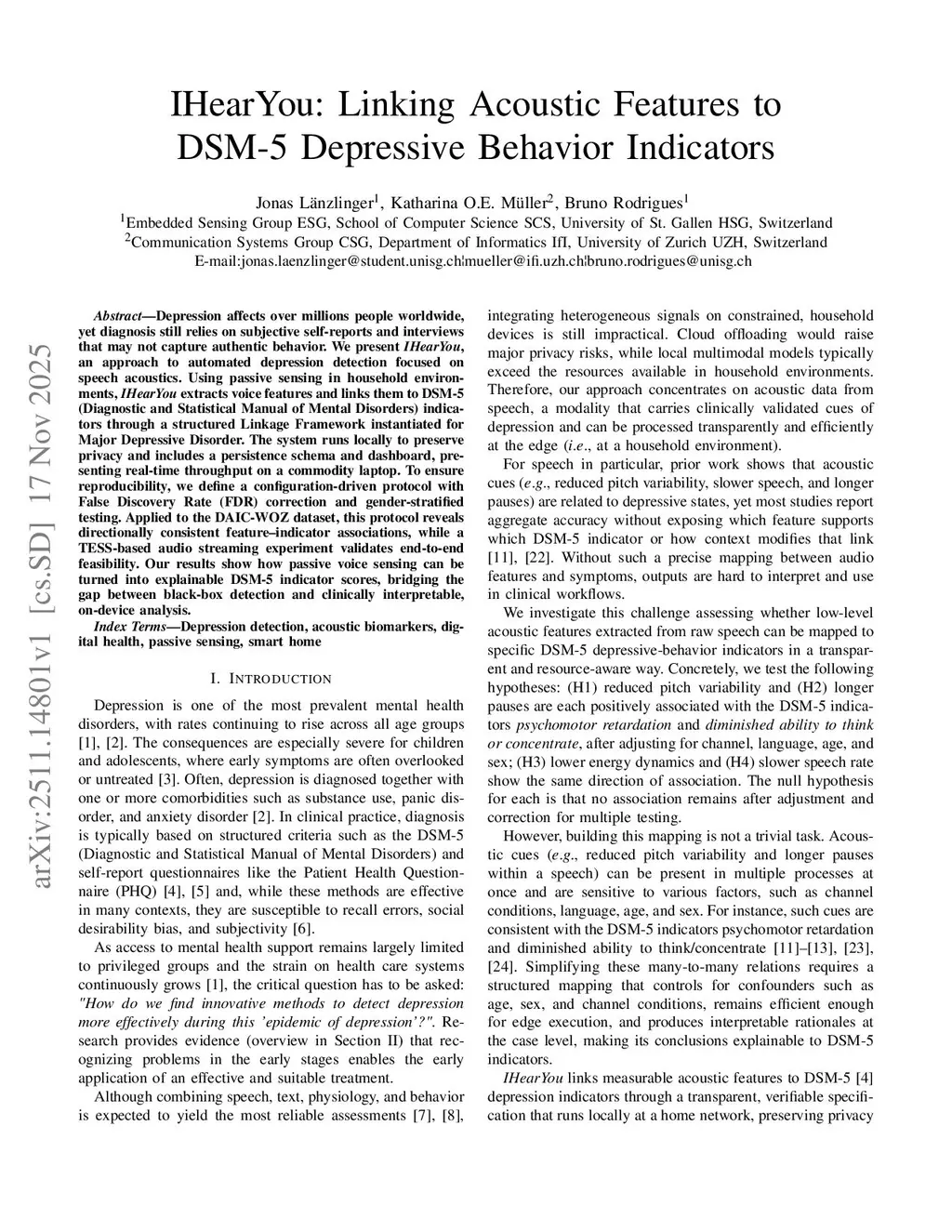 Depression affects over millions people worldwide, yet diagnosis still relies on subjective self-reports and interviews that may not capture authentic behavior. We present IHearYou, an approach to automated depression detection focused on speech acoustics. Using passive sensing in household environments, IHearYou extracts voice features and links them to DSM-5 (Diagnostic and Statistical Manual of Mental Disorders) indicators through a structured Linkage Framework instantiated for Major Depressive Disorder. The system runs locally to preserve privacy and includes a persistence schema and dashboard, presenting real-time throughput on a commodity laptop. To ensure reproducibility, we define a configuration-driven protocol with False Discovery Rate (FDR) correction and gender-stratified testing. Applied to the DAIC-WOZ dataset, this protocol reveals directionally consistent feature-indicator associations, while a TESS-based audio streaming experiment validates end-to-end feasibility. Our results show how passive voice sensing can be turned into explainable DSM-5 indicator scores, bridging the gap between black-box detection and clinically interpretable, on-device analysis.