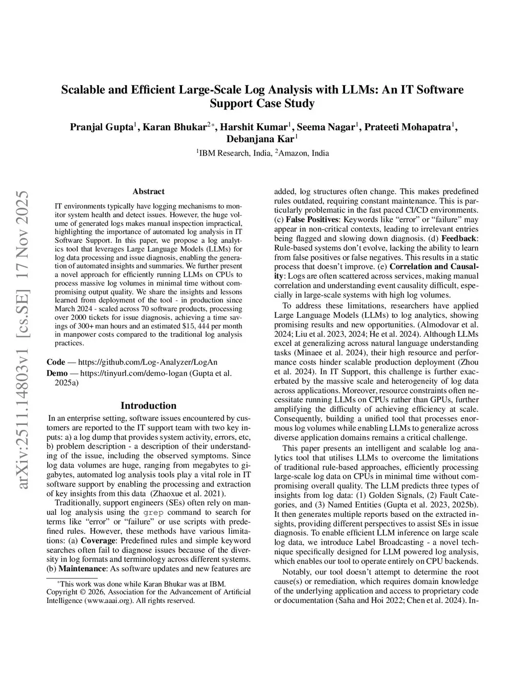 IT environments typically have logging mechanisms to monitor system health and detect issues. However, the huge volume of generated logs makes manual inspection impractical, highlighting the importance of automated log analysis in IT Software Support. In this paper, we propose a log analytics tool that leverages Large Language Models (LLMs) for log data processing and issue diagnosis, enabling the generation of automated insights and summaries. We further present a novel approach for efficiently running LLMs on CPUs to process massive log volumes in minimal time without compromising output quality. We share the insights and lessons learned from deployment of the tool - in production since March 2024 - scaled across 70 software products, processing over 2000 tickets for issue diagnosis, achieving a time savings of 300+ man hours and an estimated $15,444 per month in manpower costs compared to the traditional log analysis practices.
