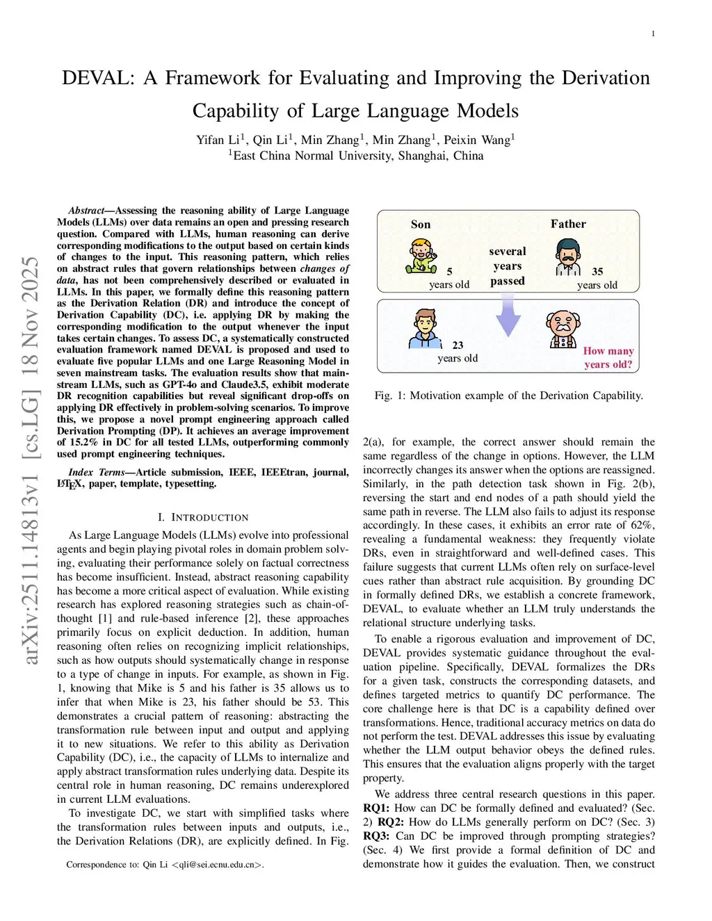 Assessing the reasoning ability of Large Language Models (LLMs) over data remains an open and pressing research question. Compared with LLMs, human reasoning can derive corresponding modifications to the output based on certain kinds of changes to the input. This reasoning pattern, which relies on abstract rules that govern relationships between changes of data, has not been comprehensively described or evaluated in LLMs. In this paper, we formally define this reasoning pattern as the Derivation Relation (DR) and introduce the concept of Derivation Capability (DC), i.e. applying DR by making the corresponding modification to the output whenever the input takes certain changes. To assess DC, a systematically constructed evaluation framework named DEVAL is proposed and used to evaluate five popular LLMs and one Large Reasoning Model in seven mainstream tasks. The evaluation results show that mainstream LLMs, such as GPT-4o and Claude3.5, exhibit moderate DR recognition capabilities but reveal significant drop-offs on applying DR effectively in problem-solving scenarios. To improve this, we propose a novel prompt engineering approach called Derivation Prompting (DP). It achieves an average improvement of 15.2% in DC for all tested LLMs, outperforming commonly used prompt engineering techniques.