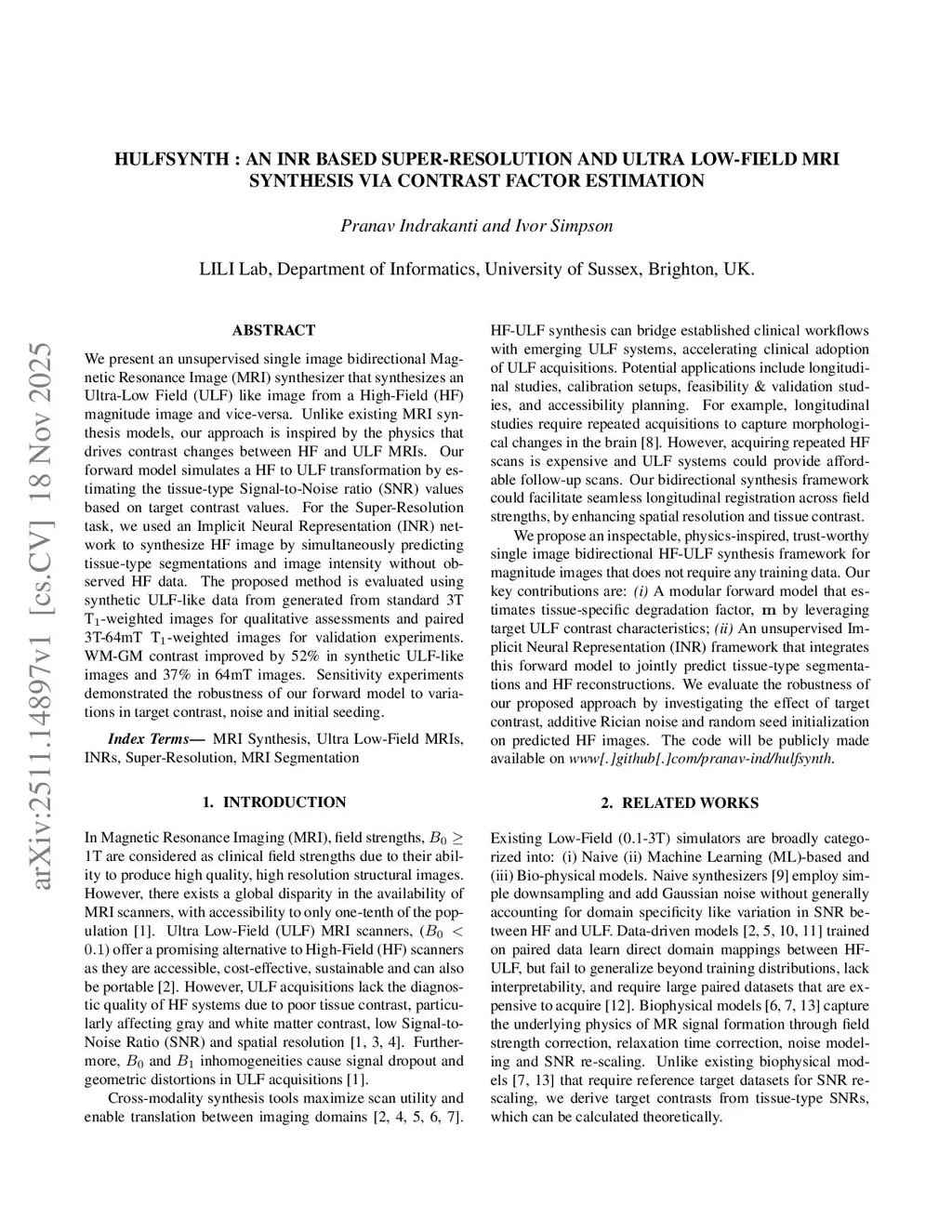HULFSynth : An INR based Super-Resolution and Ultra Low-Field MRI Synthesis via Contrast factor estimation