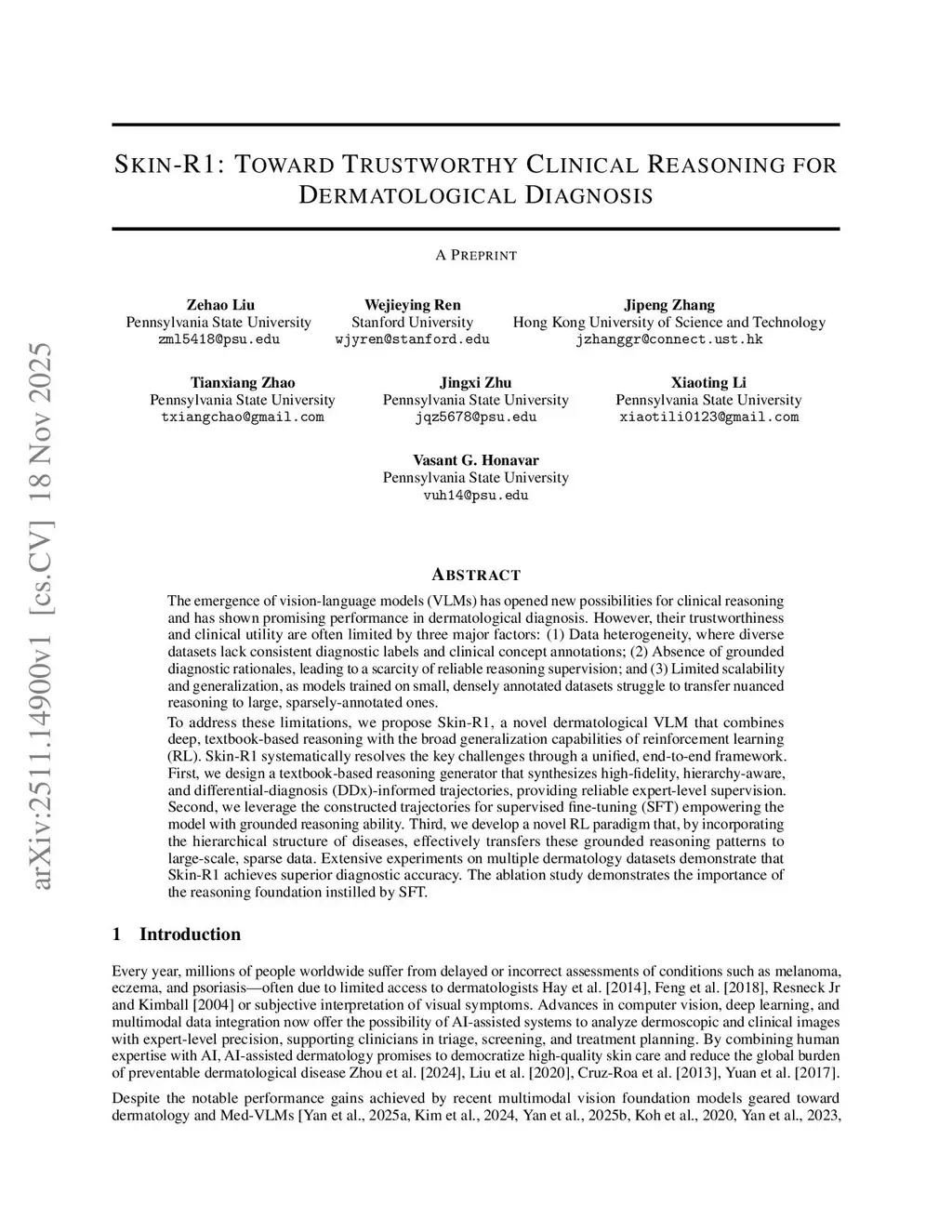 The emergence of vision-language models (VLMs) has opened new possibilities for clinical reasoning and has shown promising performance in dermatological diagnosis. However, their trustworthiness and clinical utility are often limited by three major factors: (1) Data heterogeneity, where diverse datasets lack consistent diagnostic labels and clinical concept annotations; (2) Absence of grounded diagnostic rationales, leading to a scarcity of reliable reasoning supervision; and (3) Limited scalability and generalization, as models trained on small, densely annotated datasets struggle to transfer nuanced reasoning to large, sparsely-annotated ones.To address these limitations, we propose SkinR1, a novel dermatological VLM that combines deep, textbook-based reasoning with the broad generalization capabilities of reinforcement learning (RL). SkinR1 systematically resolves the key challenges through a unified, end-to-end framework. First, we design a textbook-based reasoning generator that synthesizes high-fidelity, hierarchy-aware, and differential-diagnosis (DDx)-informed trajectories, providing reliable expert-level supervision. Second, we leverage the constructed trajectories for supervised fine-tuning (SFT) empowering the model with grounded reasoning ability. Third, we develop a novel RL paradigm that, by incorporating the hierarchical structure of diseases, effectively transfers these grounded reasoning patterns to large-scale, sparse data. Extensive experiments on multiple dermatology datasets demonstrate that SkinR1 achieves superior diagnostic accuracy. The ablation study demonstrates the importance of the reasoning foundation instilled by SFT.
