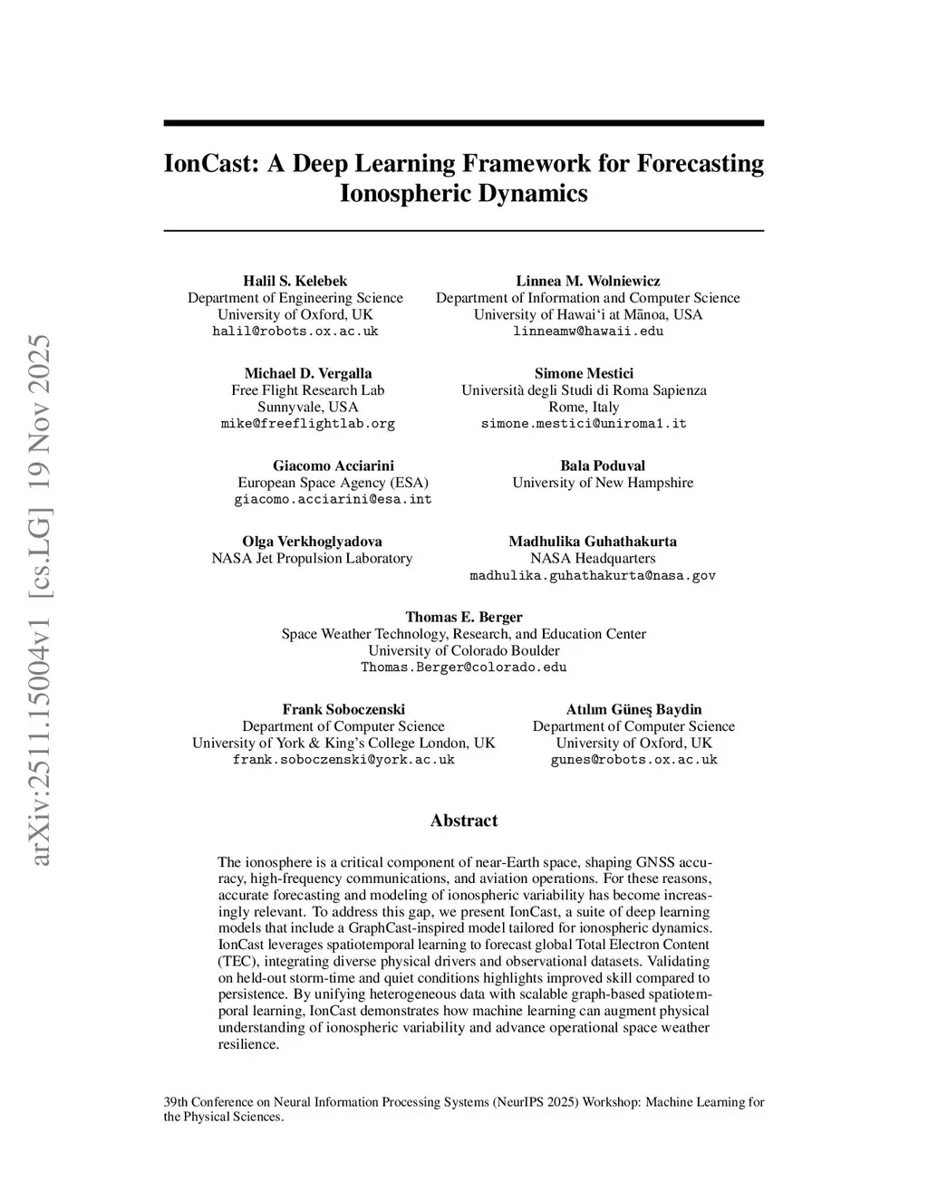 The ionosphere is a critical component of near-Earth space, shaping GNSS accuracy, high-frequency communications, and aviation operations. For these reasons, accurate forecasting and modeling of ionospheric variability has become increasingly relevant. To address this gap, we present IonCast, a suite of deep learning models that include a GraphCast-inspired model tailored for ionospheric dynamics. IonCast leverages spatiotemporal learning to forecast global Total Electron Content (TEC), integrating diverse physical drivers and observational datasets. Validating on held-out storm-time and quiet conditions highlights improved skill compared to persistence. By unifying heterogeneous data with scalable graph-based spatiotemporal learning, IonCast demonstrates how machine learning can augment physical understanding of ionospheric variability and advance operational space weather resilience.