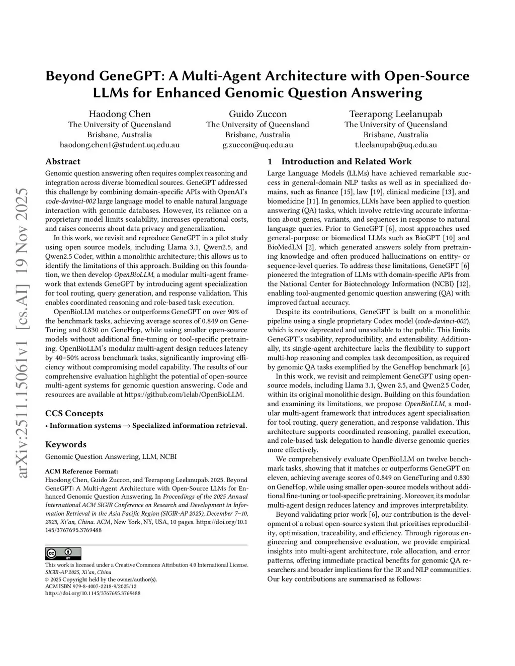 Genomic question answering often requires complex reasoning and integration across diverse biomedical sources. GeneGPT addressed this challenge by combining domain-specific APIs with OpenAI's code-davinci-002 large language model to enable natural language interaction with genomic databases. However, its reliance on a proprietary model limits scalability, increases operational costs, and raises concerns about data privacy and generalization.In this work, we revisit and reproduce GeneGPT in a pilot study using open source models, including Llama 3.1, Qwen2.5, and Qwen2.5 Coder, within a monolithic architecture; this allows us to identify the limitations of this approach. Building on this foundation, we then develop OpenBioLLM, a modular multi-agent framework that extends GeneGPT by introducing agent specialization for tool routing, query generation, and response validation. This enables coordinated reasoning and role-based task execution.OpenBioLLM matches or outperforms GeneGPT on over 90% of the benchmark tasks, achieving average scores of 0.849 on Gene-Turing and 0.830 on GeneHop, while using smaller open-source models without additional fine-tuning or tool-specific pretraining. OpenBioLLM's modular multi-agent design reduces latency by 40-50% across benchmark tasks, significantly improving efficiency without compromising model capability. The results of our comprehensive evaluation highlight the potential of open-source multi-agent systems for genomic question answering. Code and resources are available atthis https URL.
