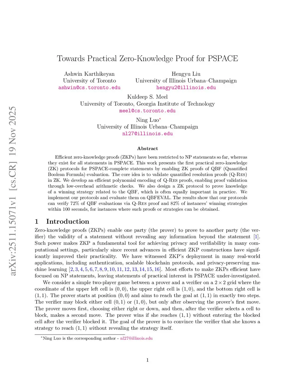 Efficient zero-knowledge proofs (ZKPs) have been restricted to NP statements so far, whereas they exist for all statements in PSPACE. This work presents the first practical zero-knowledge (ZK) protocols for PSPACE-complete statements by enabling ZK proofs of QBF (Quantified Boolean Formula) evaluation. The core idea is to validate quantified resolution proofs (Q-Res) in ZK. We develop an efficient polynomial encoding of Q-Res proofs, enabling proof validation through low-overhead arithmetic checks. We also design a ZK protocol to prove knowledge of a winning strategy related to the QBF, which is often equally important in practice. We implement our protocols and evaluate them on QBFEVAL. The results show that our protocols can verify 72% of QBF evaluations via Q-Res proof and 82% of instances' winning strategies within 100 seconds, for instances where such proofs or strategies can be obtained.