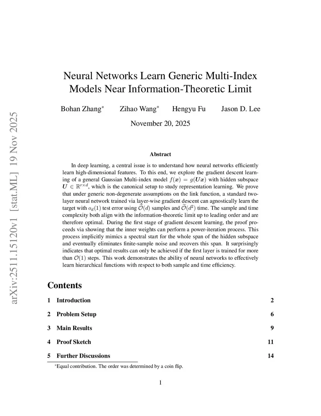 In deep learning, a central issue is to understand how neural networks efficiently learn high-dimensional features. To this end, we explore the gradient descent learning of a general Gaussian Multi-index model with hidden subspace , which is the canonical setup to study representation learning. We prove that under generic non-degenerate assumptions on the link function, a standard two-layer neural network trained via layer-wise gradient descent can agnostically learn the target with test error using samples and time. The sample and time complexity both align with the information-theoretic limit up to leading order and are therefore optimal. During the first stage of gradient descent learning, the proof proceeds via showing that the inner weights can perform a power-iteration process. This process implicitly mimics a spectral start for the whole span of the hidden subspace and eventually eliminates finite-sample noise and recovers this span. It surprisingly indicates that optimal results can only be achieved if the first layer is trained for more than steps. This work demonstrates the ability of neural networks to effectively learn hierarchical functions with respect to both sample and time efficiency.