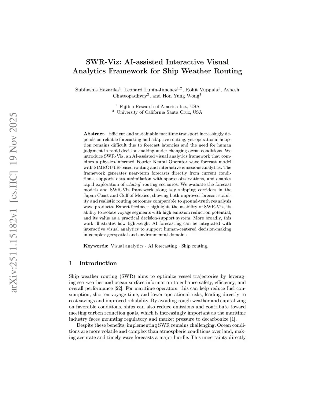 Efficient and sustainable maritime transport increasingly depends on reliable forecasting and adaptive routing, yet operational adoption remains difficult due to forecast latencies and the need for human judgment in rapid decision-making under changing ocean conditions. We introduce SWR-Viz, an AI-assisted visual analytics framework that combines a physics-informed Fourier Neural Operator wave forecast model with SIMROUTE-based routing and interactive emissions analytics. The framework generates near-term forecasts directly from current conditions, supports data assimilation with sparse observations, and enables rapid exploration of what-if routing scenarios. We evaluate the forecast models and SWR-Viz framework along key shipping corridors in the Japan Coast and Gulf of Mexico, showing both improved forecast stability and realistic routing outcomes comparable to ground-truth reanalysis wave products. Expert feedback highlights the usability of SWR-Viz, its ability to isolate voyage segments with high emission reduction potential, and its value as a practical decision-support system. More broadly, this work illustrates how lightweight AI forecasting can be integrated with interactive visual analytics to support human-centered decision-making in complex geospatial and environmental domains.