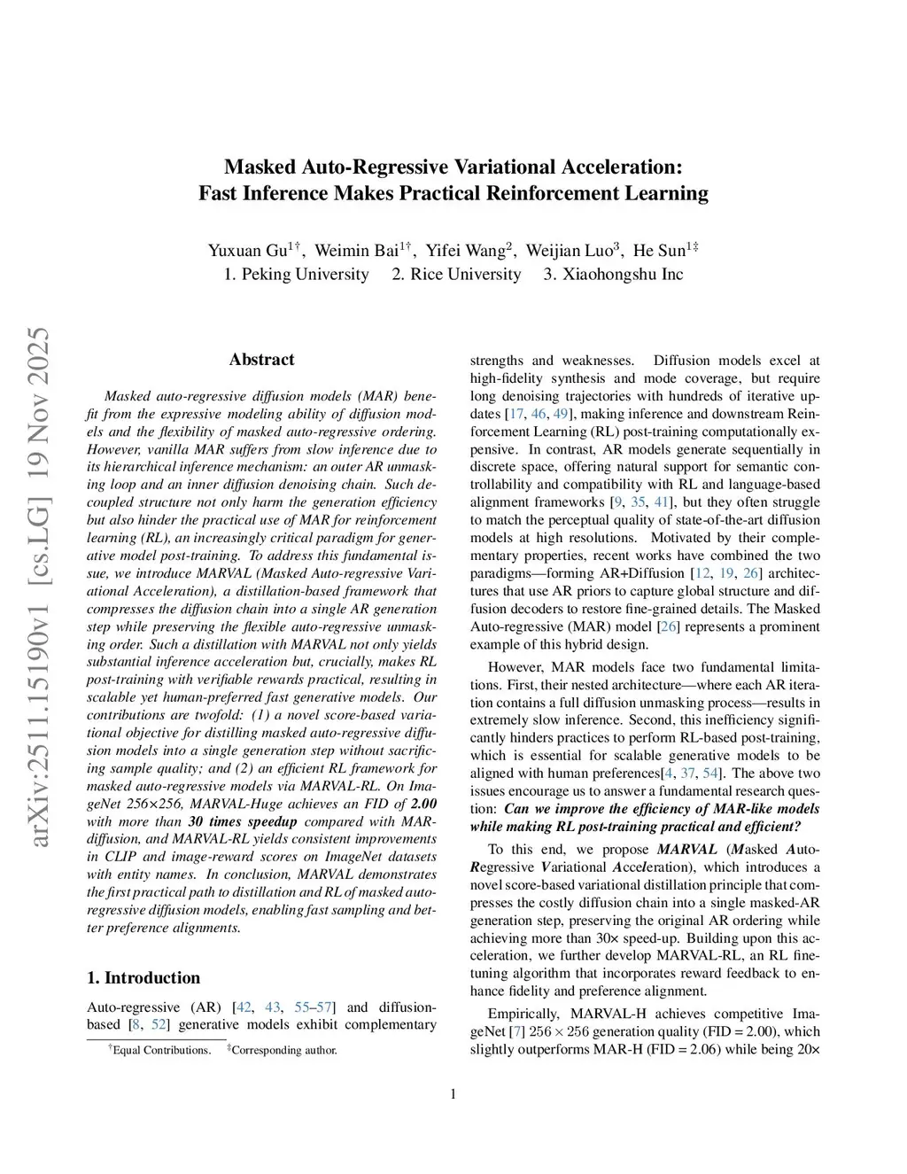 Masked auto-regressive diffusion models (MAR) benefit from the expressive modeling ability of diffusion models and the flexibility of masked auto-regressive ordering. However, vanilla MAR suffers from slow inference due to its hierarchical inference mechanism: an outer AR unmasking loop and an inner diffusion denoising chain. Such decoupled structure not only harm the generation efficiency but also hinder the practical use of MAR for reinforcement learning (RL), an increasingly critical paradigm for generative modelthis http URLaddress this fundamental issue, we introduce MARVAL (Masked Auto-regressive Variational Acceleration), a distillation-based framework that compresses the diffusion chain into a single AR generation step while preserving the flexible auto-regressive unmasking order. Such a distillation with MARVAL not only yields substantial inference acceleration but, crucially, makes RL post-training with verifiable rewards practical, resulting in scalable yet human-preferred fast generative models. Our contributions are twofold: (1) a novel score-based variational objective for distilling masked auto-regressive diffusion models into a single generation step without sacrificing sample quality; and (2) an efficient RL framework for masked auto-regressive models via MARVAL-RL. On ImageNet 256*256, MARVAL-Huge achieves an FID of 2.00 with more than 30 times speedup compared with MAR-diffusion, and MARVAL-RL yields consistent improvements in CLIP and image-reward scores on ImageNet datasets with entity names. In conclusion, MARVAL demonstrates the first practical path to distillation and RL of masked auto-regressive diffusion models, enabling fast sampling and better preference alignments.