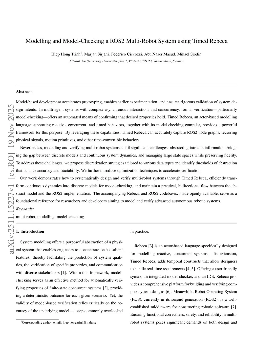Model-based development enables quicker prototyping, earlier experimentation and validation of design intents. For a multi-agent system with complex asynchronous interactions and concurrency, formal verification, model-checking in particular, offers an automated mechanism for verifying desired properties. Timed Rebeca is an actor-based modelling language supporting reactive, concurrent and time semantics, accompanied with a model-checking compiler. These capabilities allow using Timed Rebeca to correctly model ROS2 node topographies, recurring physical signals, motion primitives and other timed and time-convertible behaviors. The biggest challenges in modelling and verifying a multi-robot system lie in abstracting complex information, bridging the gap between a discrete model and a continuous system and compacting the state space, while maintaining the model's accuracy. We develop different discretization strategies for different kinds of information, identifying the énough' thresholds of abstraction, and applying efficient optimization techniques to boost computations. With this work we demonstrate how to use models to design and verify a multi-robot system, how to discretely model a continuous system to do model-checking efficiently, and the round-trip engineering flow between the model and the implementation. The released Rebeca and ROS2 codes can serve as a foundation for modelling multiple autonomous robots systems.