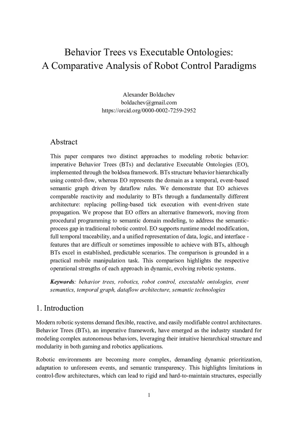 This paper compares two distinct approaches to modeling robotic behavior: imperative Behavior Trees (BTs) and declarative Executable Ontologies (EO), implemented through the boldsea framework. BTs structure behavior hierarchically using control-flow, whereas EO represents the domain as a temporal, event-based semantic graph driven by dataflow rules. We demonstrate that EO achieves comparable reactivity and modularity to BTs through a fundamentally different architecture: replacing polling-based tick execution with event-driven state propagation. We propose that EO offers an alternative framework, moving from procedural programming to semantic domain modeling, to address the semantic-process gap in traditional robotic control. EO supports runtime model modification, full temporal traceability, and a unified representation of data, logic, and interface - features that are difficult or sometimes impossible to achieve with BTs, although BTs excel in established, predictable scenarios. The comparison is grounded in a practical mobile manipulation task. This comparison highlights the respective operational strengths of each approach in dynamic, evolving robotic systems.